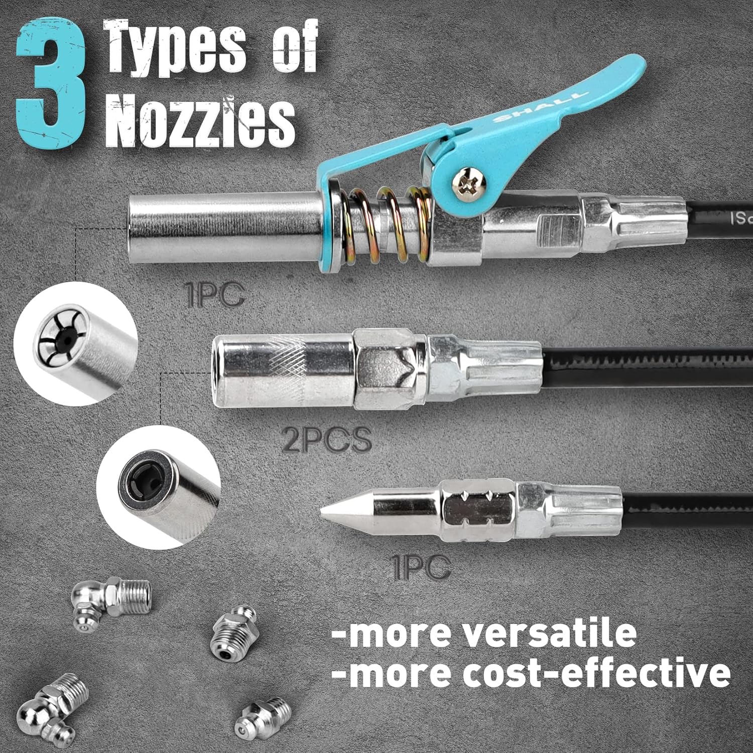 - Complete Grease Gun Set: Includes a heavy duty grease gun, 1x upgraded 6-jaw grease gun coupler, 1x 18” spring flex hose, 1x 4-jaw reinforced coupler, 1x extension bend pipe, 1x extension stright pipe, 1x sharp nozzle, 1x fittings cleaner and 1x glove