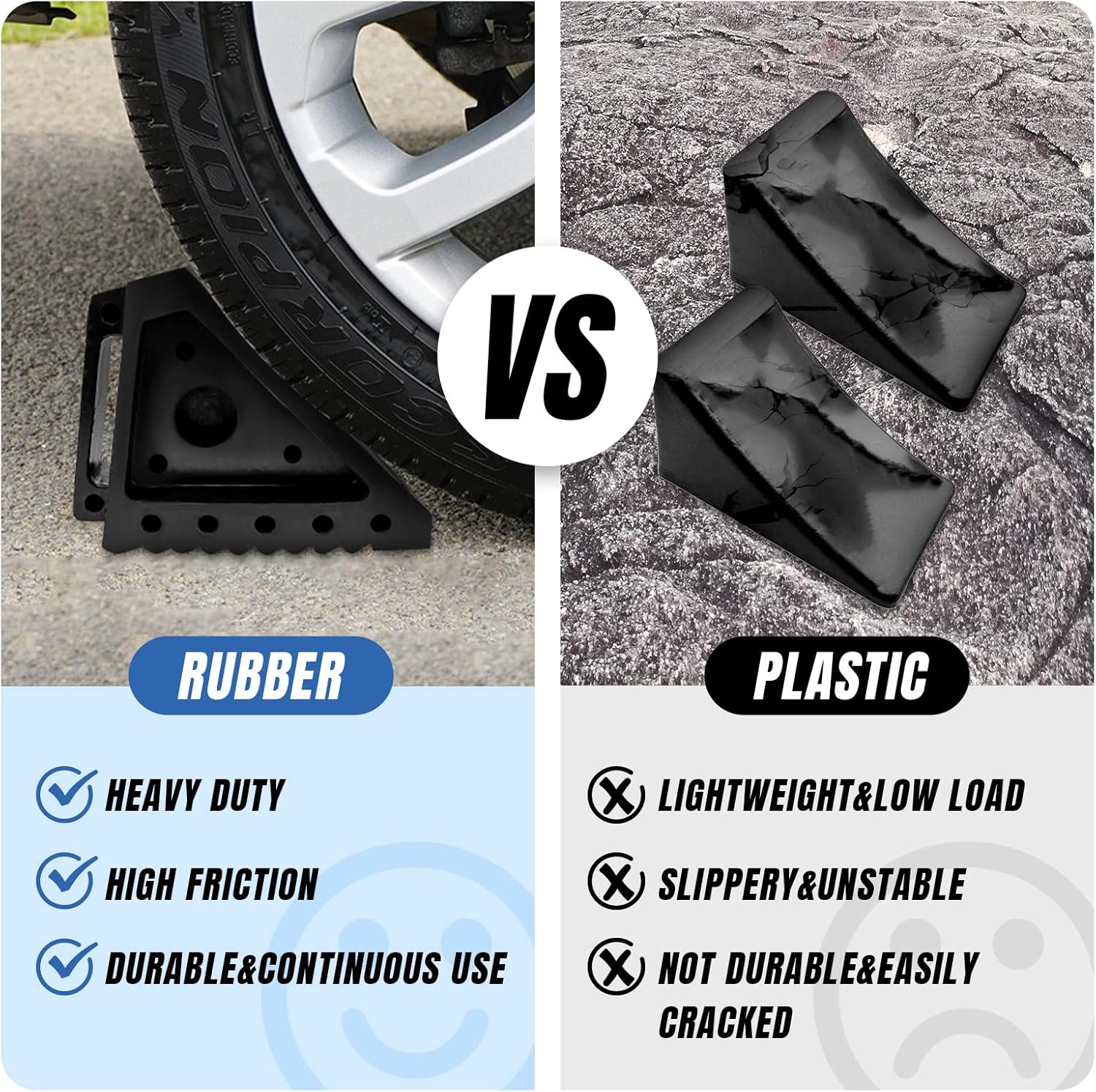 - UPGRADED PREMIUM RUBBER: Wheel chocks adopt an upgraded version of premium rubber, and use nylon-enhanced technology. Which is twice as strong as ordinary rubber. Unlike similar products that will slip, crush, oxidize, tear or break, these wheels chock can better resist UV rays and antioxidant, are more solid and durable