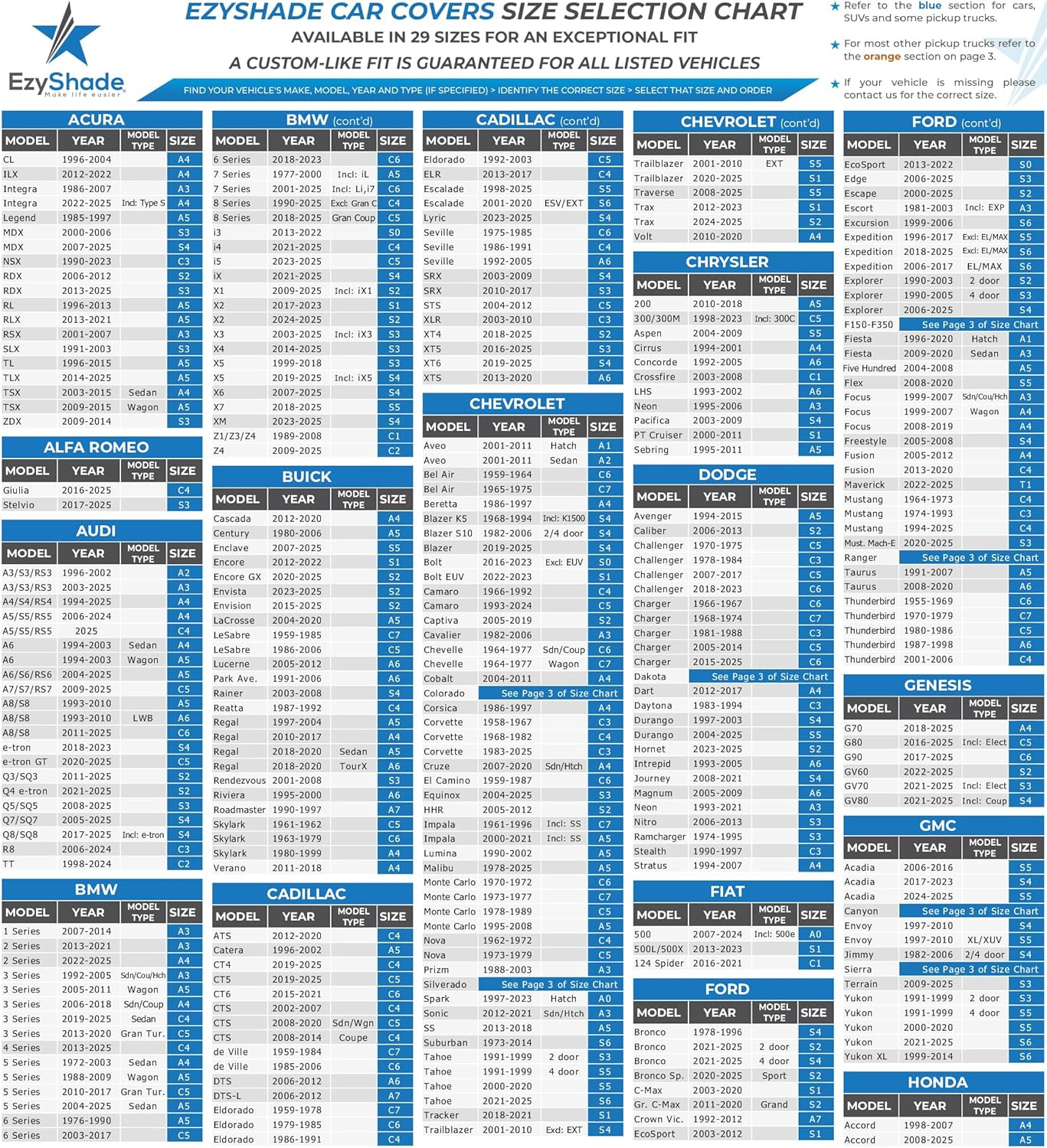 - MULTIPLE SIZES FOR MULTIPLE TRUCK TYPES. Not all trucks are alike – with huge variations in overall size, cab configuration and box design, many universal truck covers will not fit right, but EzyShade’s T Size range will cover your particular truck just right! Find your truck in the SIZE CHART (see the Size Chart in images 4 to 6).