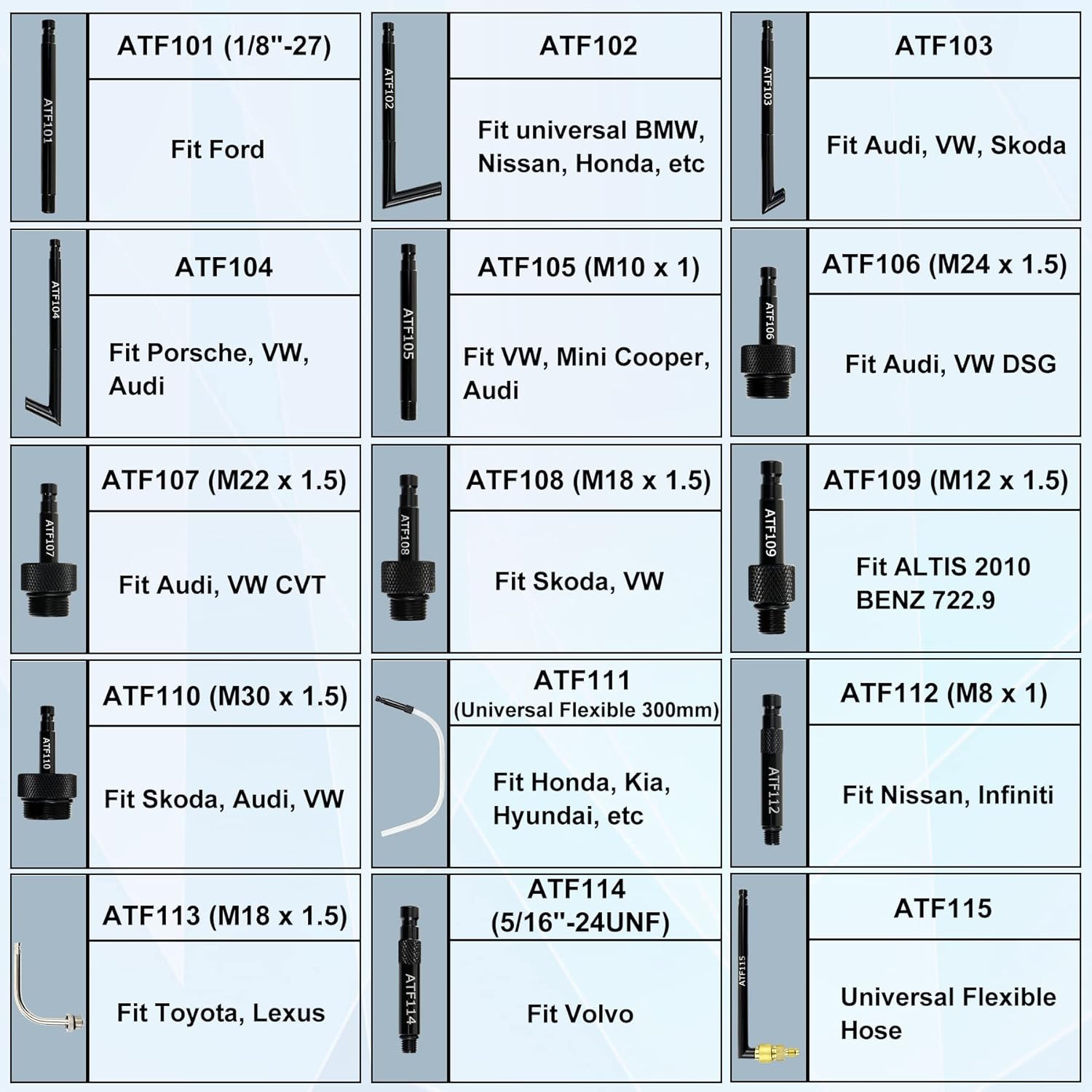 - ATF Adapters: There are 15 specific ATF adapters included in this pneumatic ATF fluid pump kit, installed on the car oil pan and perform transmission fluid refill service for the ATF filler system. Multiple adapters constructed from hardened steel for maximum strength and longevity. Black electrophoretic finish for rust and corrosion resistance. Kit is suitable for Ford, BMW, Nissan, VW, Audi, Toyota, Volvo, Porsche, Benz, Hyundai, Infiniti, Lexus and etc