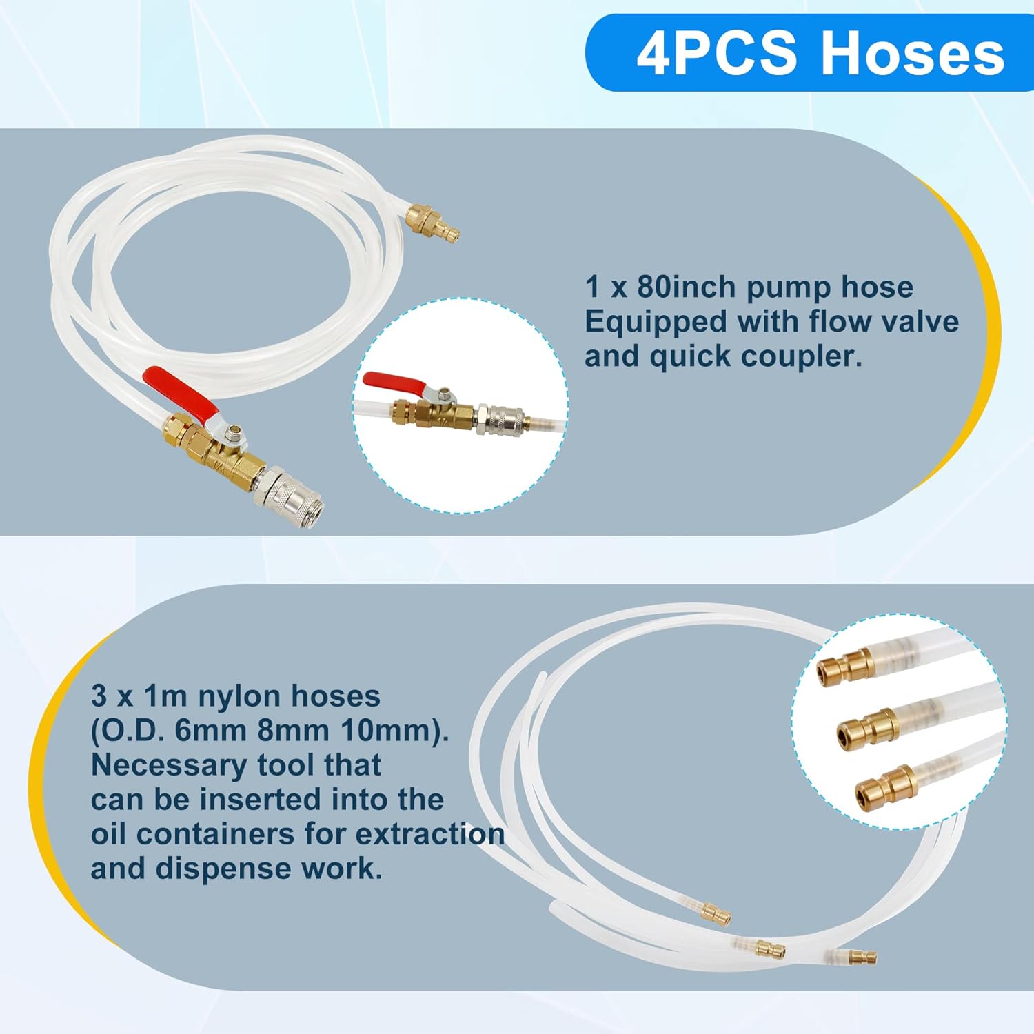 - 3PCS 1M Hoses: O.D. 6mm 8mm 10mm. Connect both ends of the 80'' hose with quick coupling to pump and the selected nylon hose first. They make the pump more suitable for various makes and models. The blue knob must be consistent with the air control switch valve: Extract or Dispense. The 1M nylon hose can be inserted into the car oil container or dipstick hole directly to extract waste oil for recycle and dispense the new oil for refilling. No need to jack up the vehicle and crawl under it