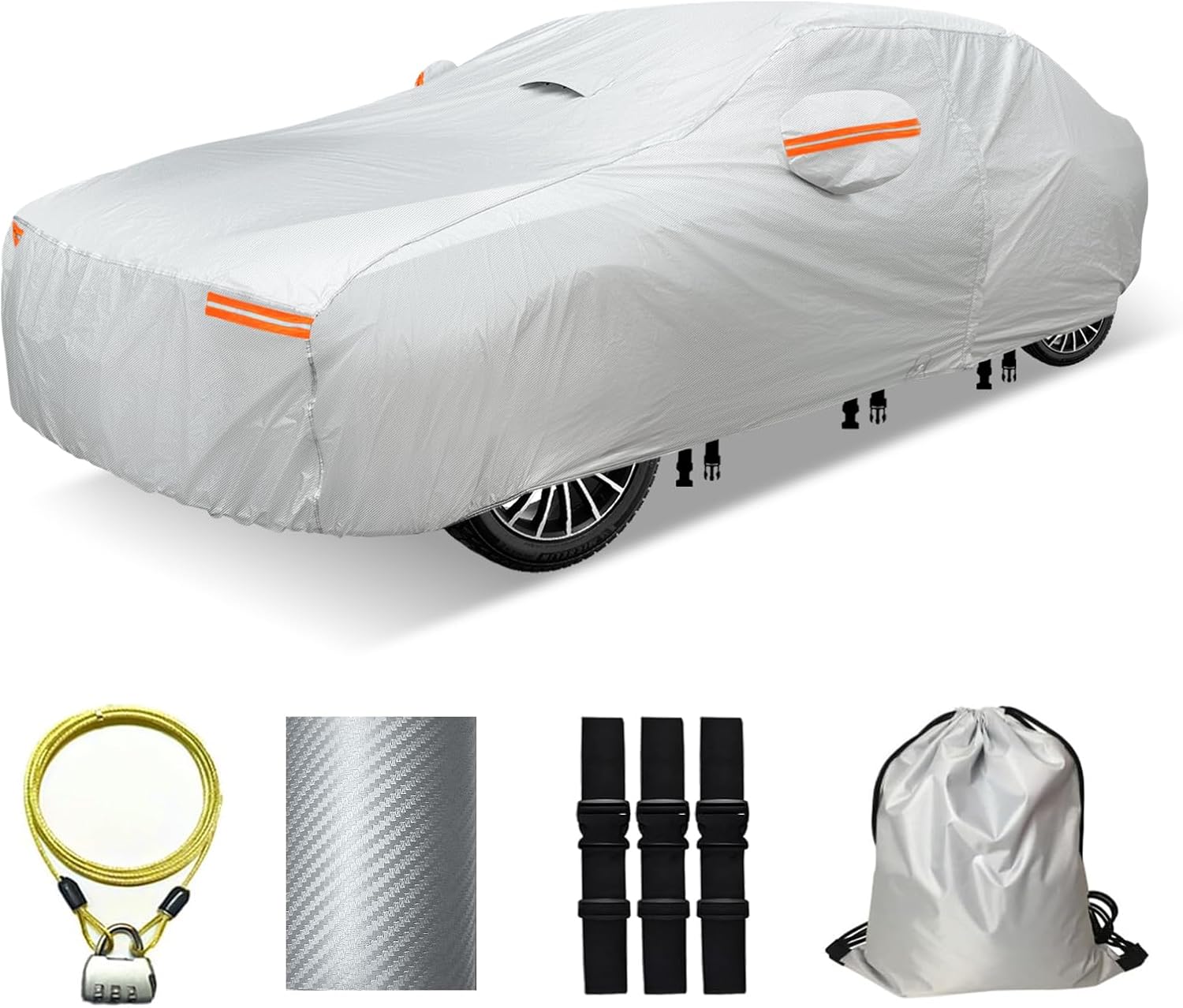 - The car cover is equipped with 3 windproof straps strategically placed around the cover for enhanced stability during strong winds.