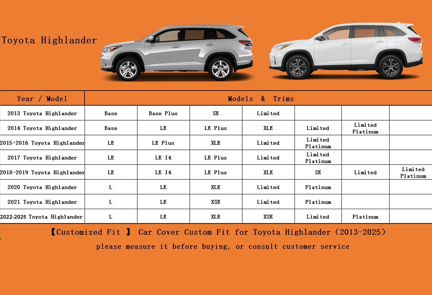 - ăSuitable forăâ Custom fit for Toyota Highlander (2007-2025). Come with a large enough portable bag to store your cover when you do not use