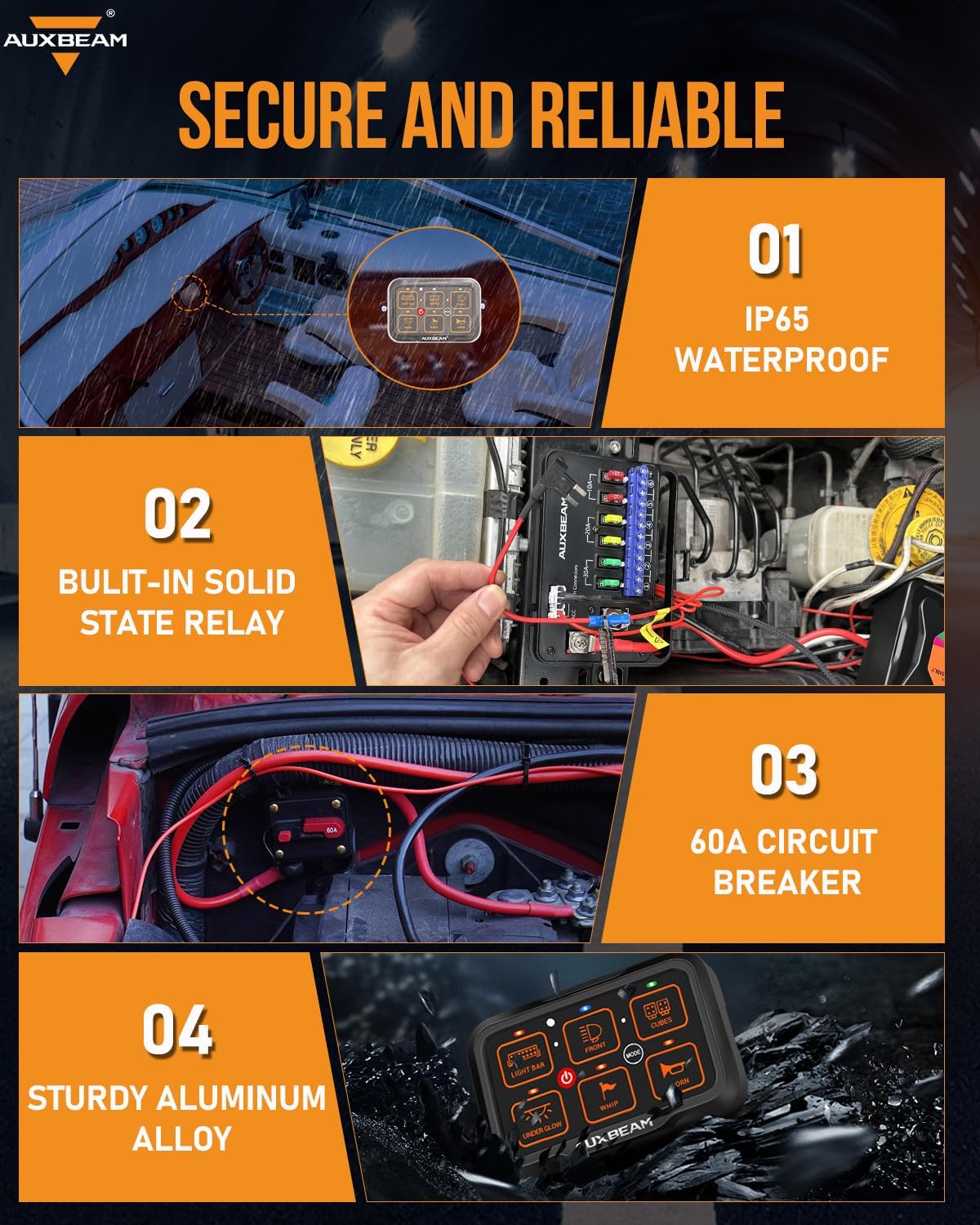 - Pro-Grade Safety & Durability:Built-in solid state relay and 10FT extended wiring harness, this AUXBEAM AR-600 switch panel delivers 720W@12V/1400W@24V power handling (60A max). Includes 60 adhesive labels and a protective dust cover for clean cabling.