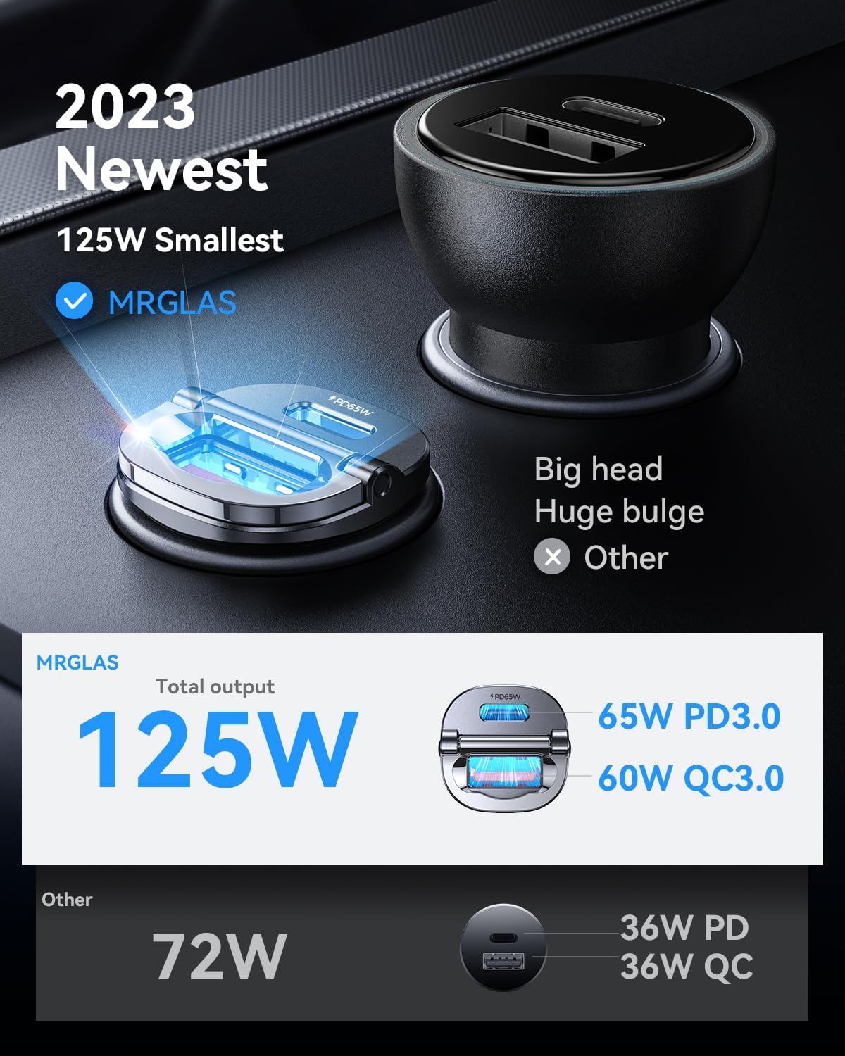 - OFFICIALLY APPROVED PD65W+QC60W FAST CHARGING: MRGLAS 125W fast USB C car charger supporting PD65W(usb-c port) and QC60W(usb-a port) high output, can fast charge all prevailing phones/iPad/tablet at the same time. Makes the IPhone 14 Pro Max and Samsung Galaxy S22 charging time from 0% to 90% in 30 minutes.