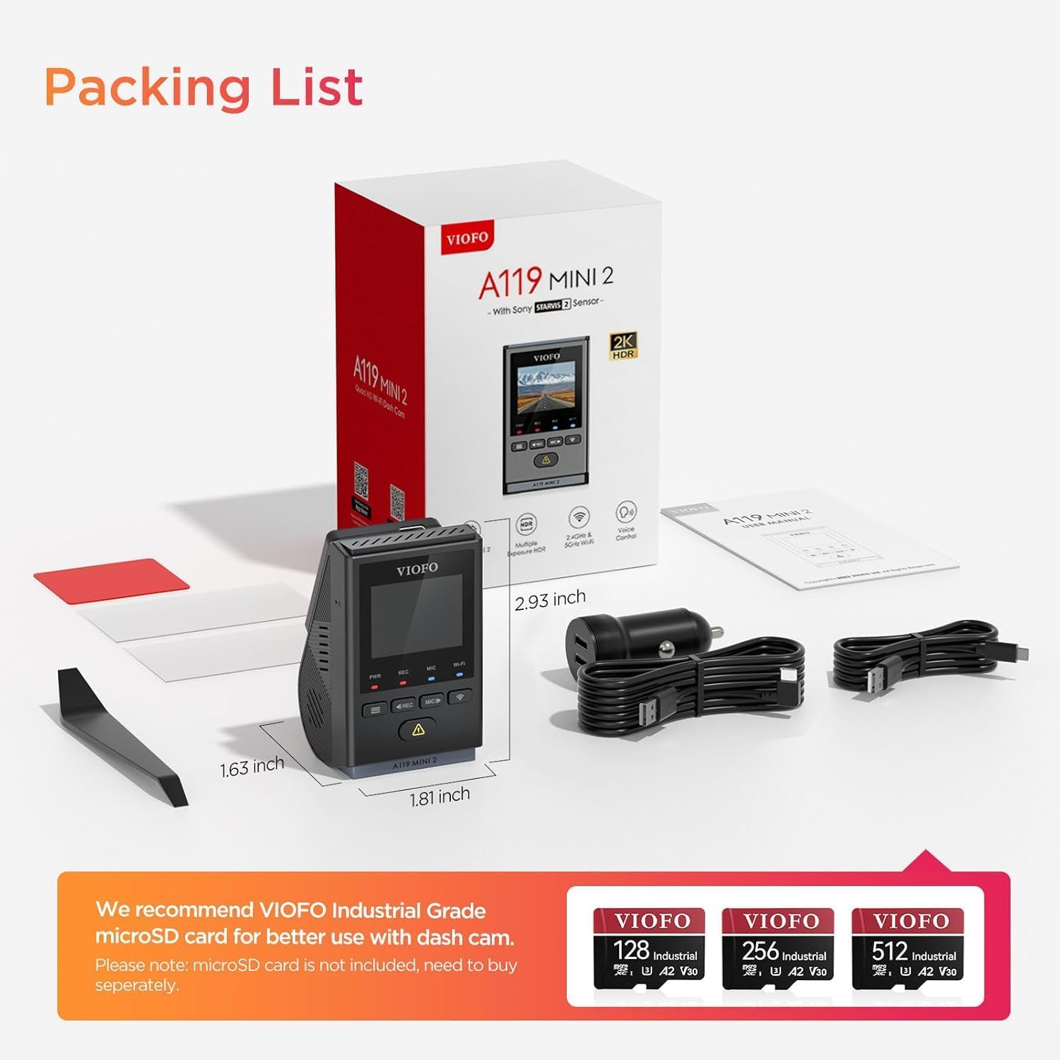 - 【Optional Memory Card Recommendation】 VIOFO industrial high endurance microSD cards, optimized for dashcam recording, give greater assurances around compatibility and long-life durability, greatly elevating your dashcam owner experience. There are different options for your choice - 64GB/128GB/256GB/512GB. (*NOT Included. Please separately purchase it in VIOFO store.)