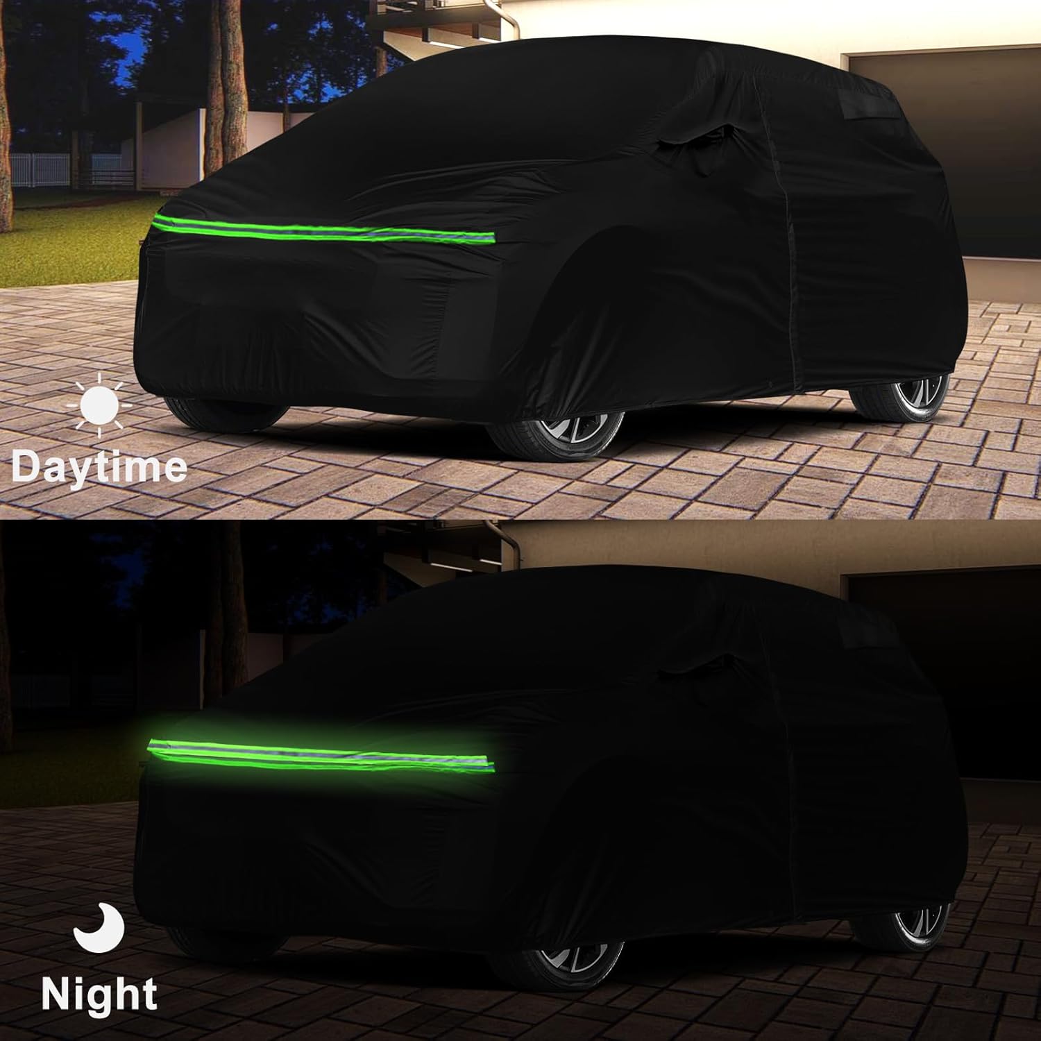- Thoughtful Design: 1: Driver side zipper design - easy in and out without taking off the cover; 2: reflection stripes - making car easily seen and avoid accidents; 3: securing straps underneath - keeps your car in place even in windy days.4: Pretty Mirror Pockets perfectly protect your mirror form damage