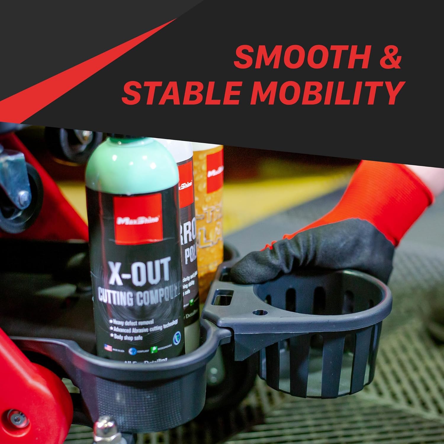 - Organized Efficiency; Integrated drawer and dual bottle holders keep tools, cleaning compounds, and brushes within reach; Stay focused on repairs or detailing without searching for essentials