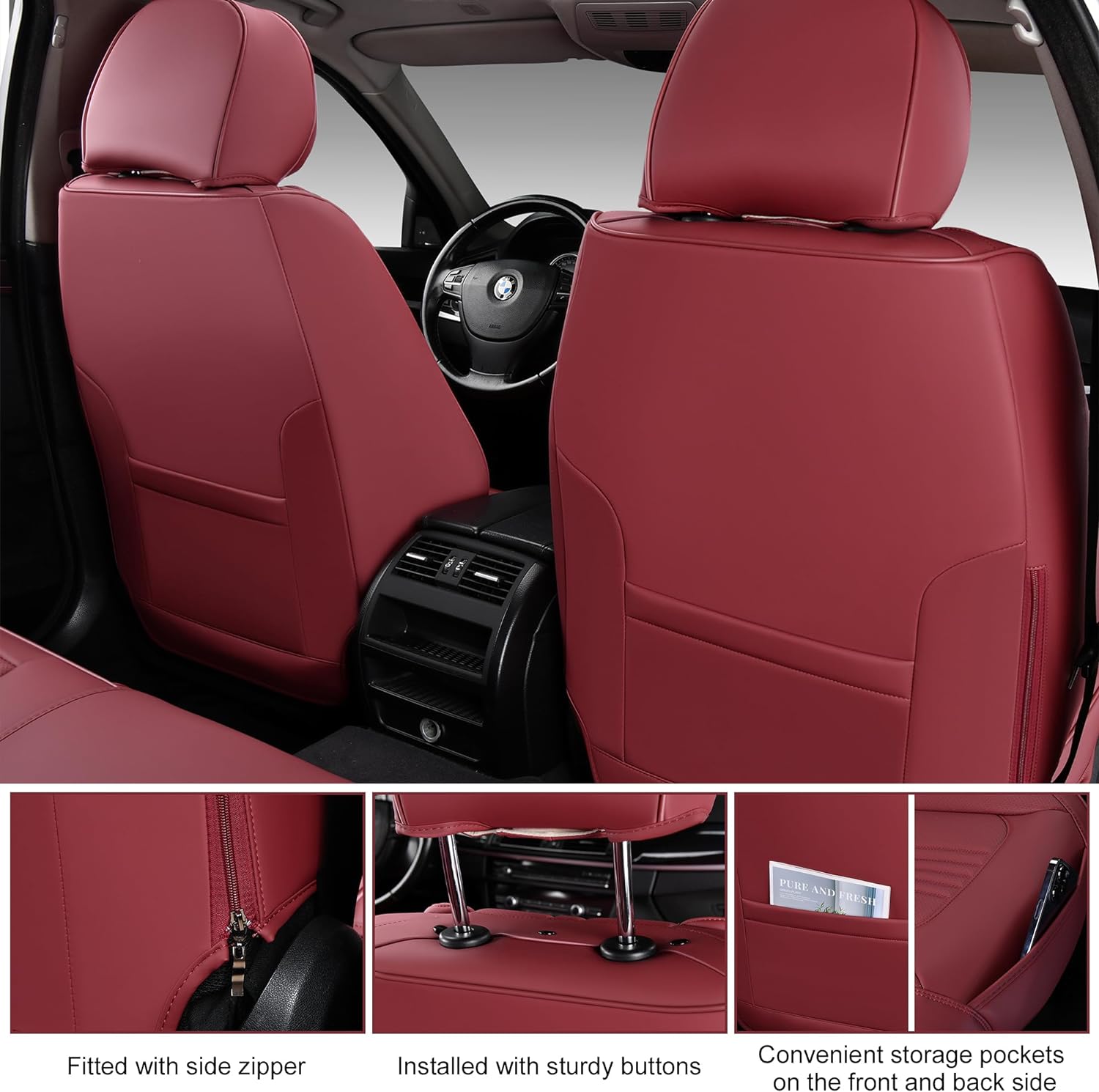 Front Seat Covers, 2 Pieces Universal Seat Covers for Cars, Waterproof Leather Auto Seat Protectors with Head Pillow, Car Seat Cushions Fit for Most Sedans SUV Pick-up Truck, Wine Red