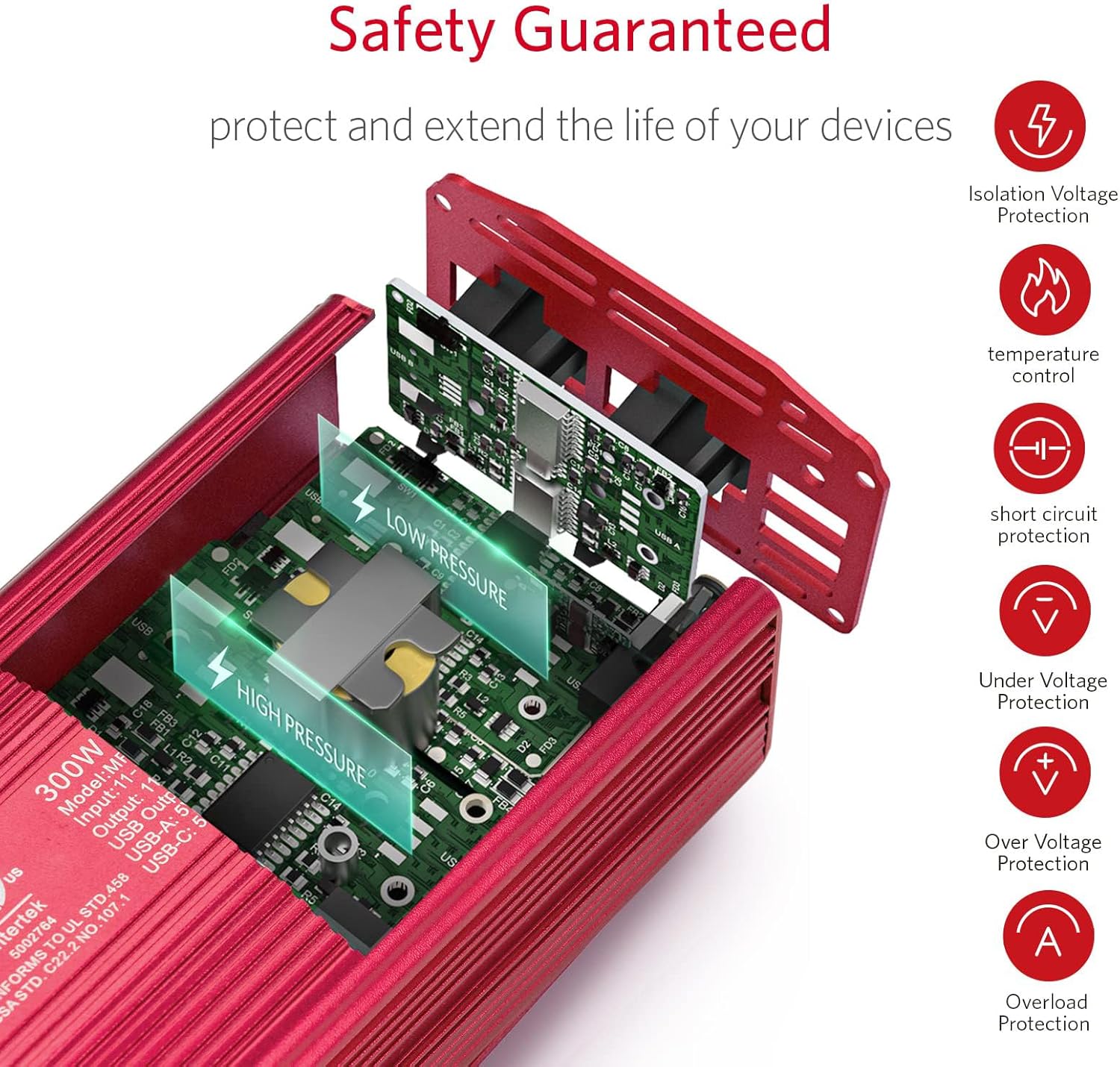 - POWERFUL 300W CAR POWER INVERTER: Car inverter provides 300 Watts continuous, 700 Watts peak surge during load start-up. This inverter 12v to 110v comes with PD 30W and QC 18W USB ports, 2 AC power outlets and 24 inch cable with cigarette lighter plug.