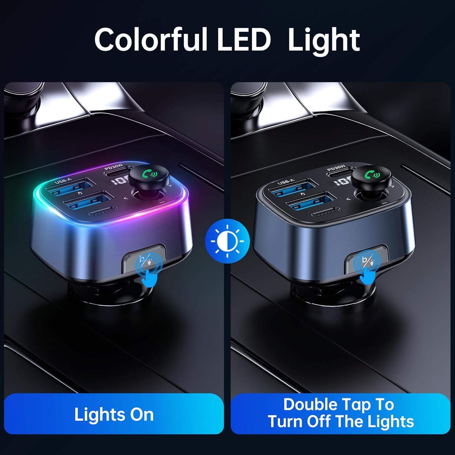 Syncwire Bluetooth 5.3 FM Transmitter Car Adapter 48W(PD 36W & 12W) [Light Switch] [Hi-Fi Deep Bass] [Fast Charging] Wireless Radio Music Adapter LED Display Hands-Free Calling Support USB Drive