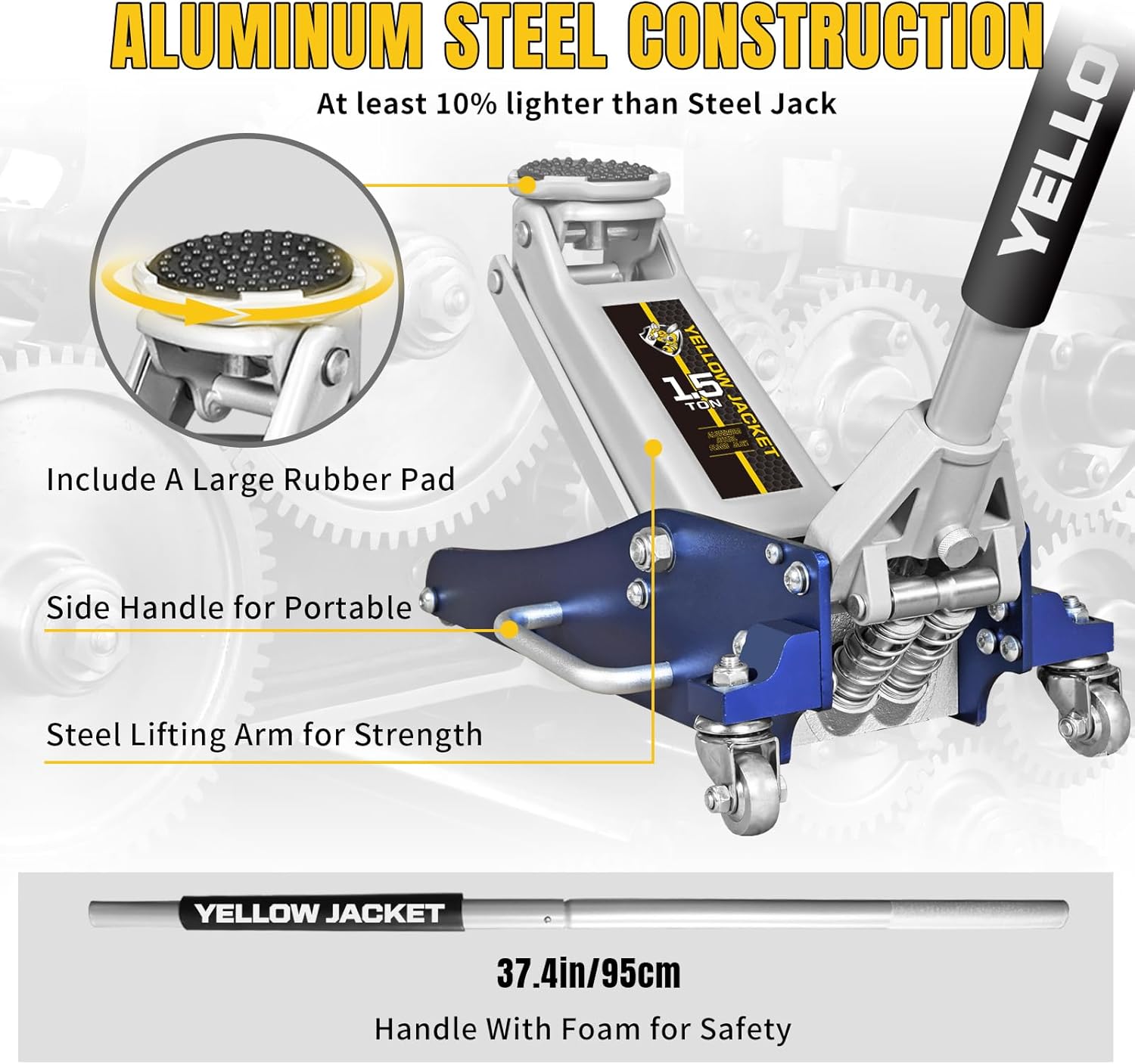 YELLOW JACKET Floor Jack 1.5 Ton Hydraulic Low Profile Aluminum and Steel Car Jack Lightweight Service Jack with Quick Lift Dual Pump, 3300 lbs Capacity