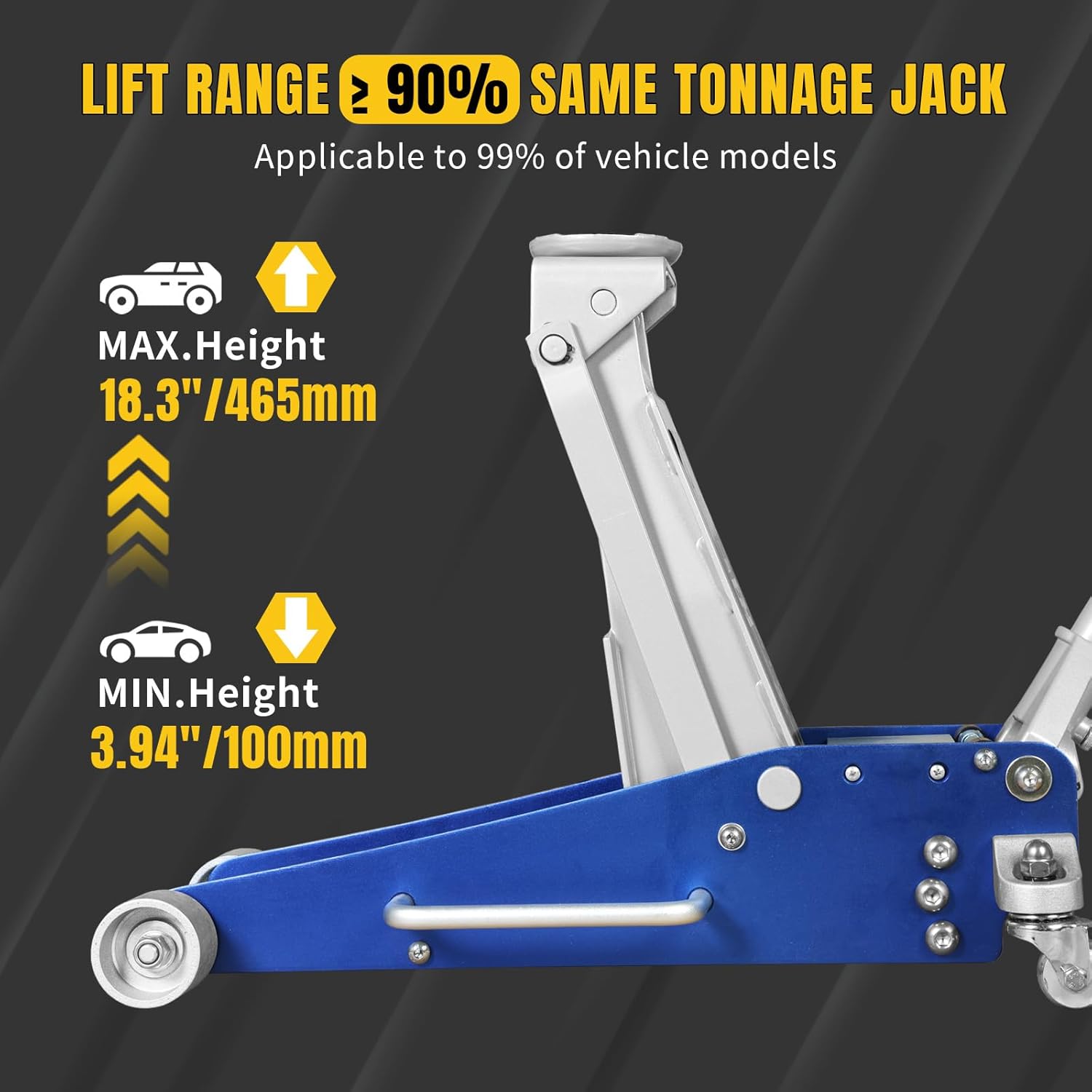 - Jack Capacity: Car jack is constructed of heavy-duty steel and durable aluminum, making it more sturdy. LIFTING CAPACITY: 2.5 ton(5500lbs). LIFTING RANGE:Min height: 3-15/16"/100mm. Max height:18-5/16"/465mm.It is used for family cars, trucks, SUVs, etc