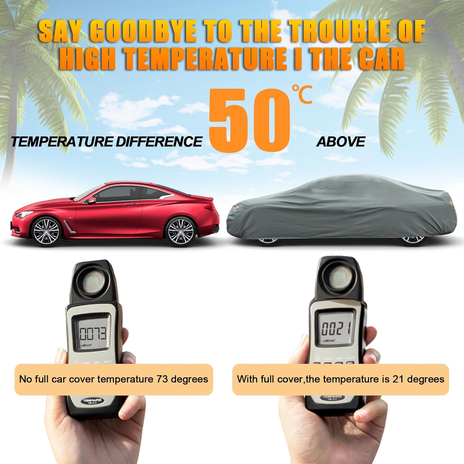 - 【High quality material】-Kayme car cover is made of 180G 5 layer non-woven fabric. The inner membrane has a good waterproof effect and is very suitable for rain and snow protection. 2. The multilayer non-woven fabric has good sun protection and UV protection performance, and can keep the car cool in summer. 3 Thick and soft lining will protect your vehicle