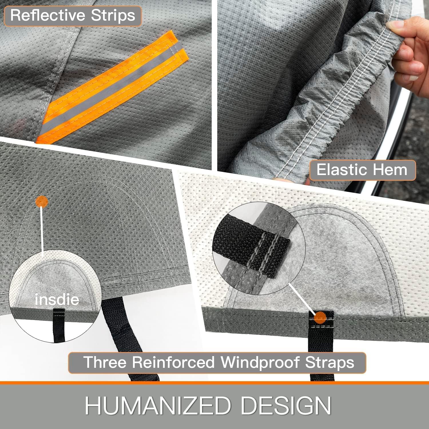 - 【Unique Design】1.Three windproof belts can protect your car cover from being blown away by strong winds. 2.Double seam technology is used to make the car cover more tightly stitched and more durable than most similar covers. 3. 4 transverse orange reflective strips ,remind other people in the night, avoid accidents in dark environments. 3.The elastic hem at the bottom makes the car cover fit the car better.