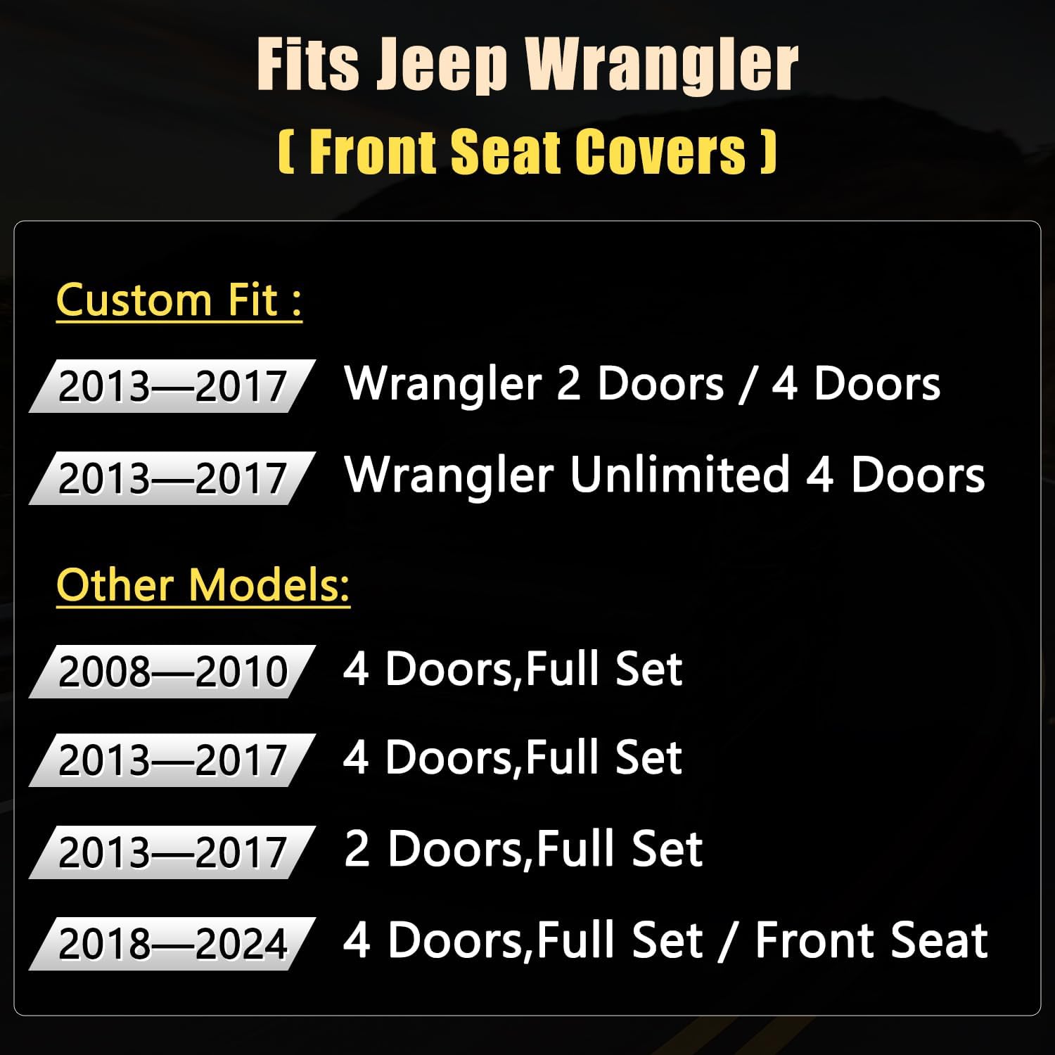 - ăCUSTOM FITă - Front seat covers customized according to the original car seat size 1:1, which will fit Wrangler JK 2/4 Door 2013 2014 2015 2016 2017 like a glove.