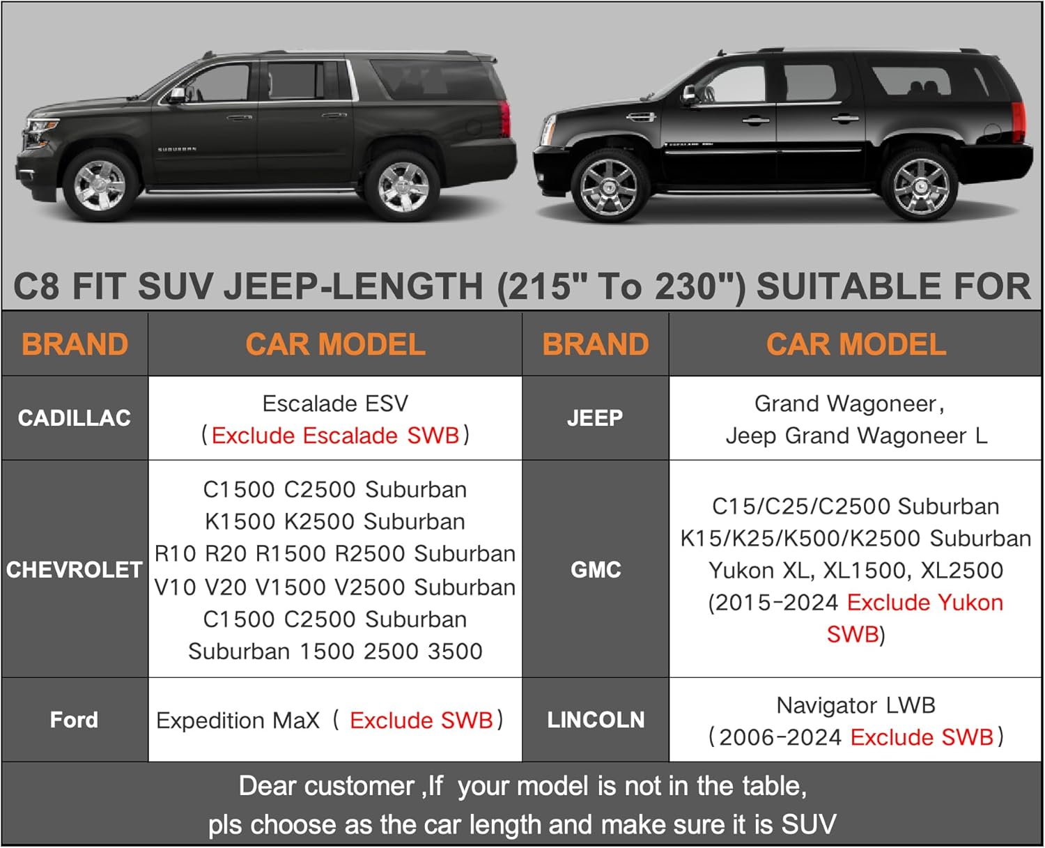 - ăDimension C8ăUniversal fit for Suv which length is 215-230 inch (Not for hatchback and sedan). Suitable for Chevrolet Chevy Suburban, GMC Yukon XL, Cadillac Escalade ESV, Ford Expedition Max etc.