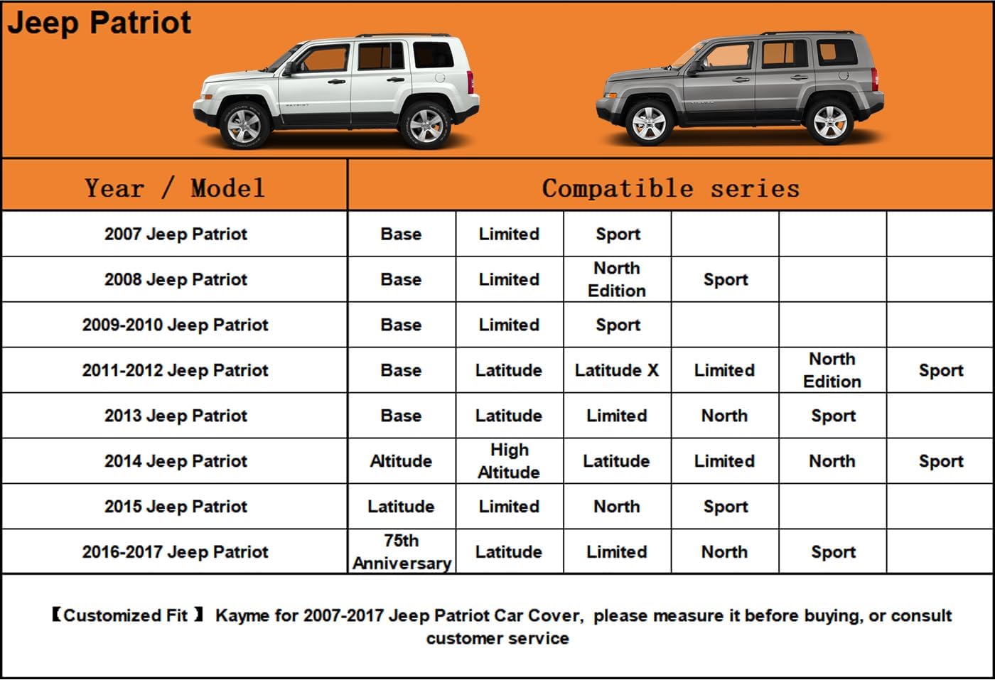 - ăSuitable forăâ Custom fit for Jeep Patriot (2007-2017). Come with a large enough portable bag to store your cover when you do not use