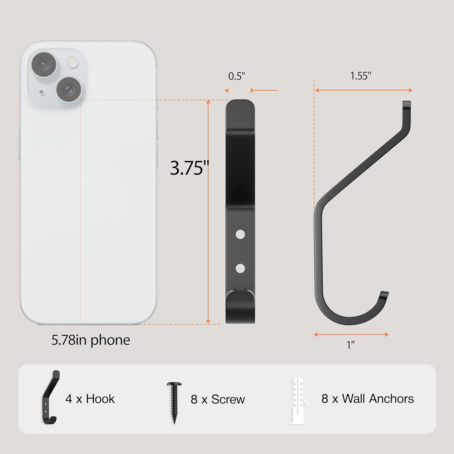 Wall Hook for Hanging Coat - 20LB (Max), Stainless Hooks for Towel, Hat, Backpack, Clothes, Wall Mounted Coat Hanger for Closet, Metal, Black, 6 Pack 3.75“