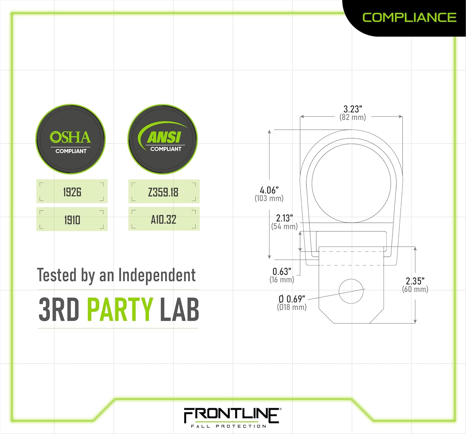 - Meets or exceeds ANSI Z359.18, ANSI A10.32, OSHA 1926 and OSHA 1910