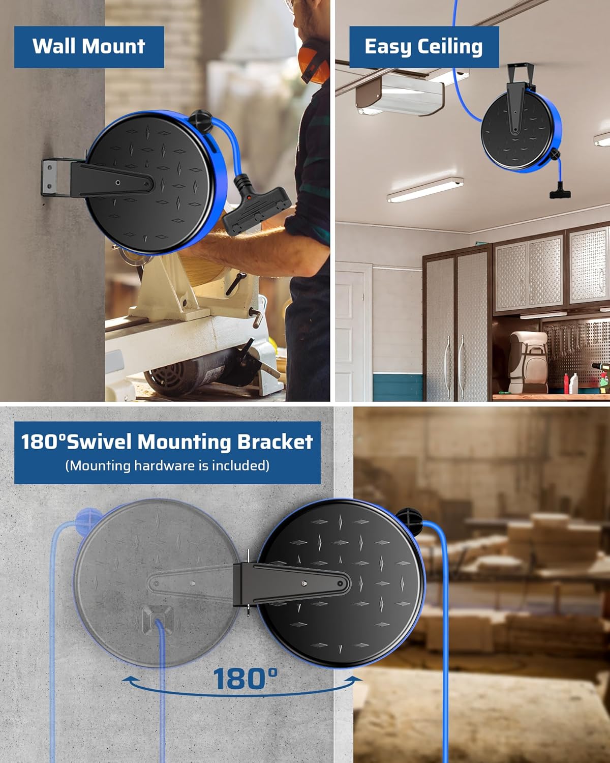- [Ceiling/Wall Mount with 180Β° Swivel Bracket] The swivel mounting bracket lets the extension cord reel swivel freely up to 180 degrees; perfect for hanging from your garage ceiling or mounting to a wall; easy to pull and release cord, freeing up more workspace and make storage a breeze; avoid tangled cords or people tripping up