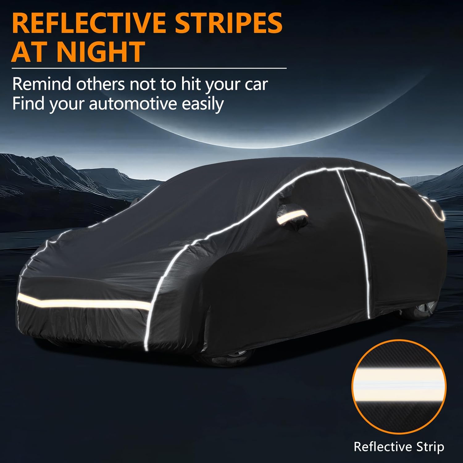 - Thoughtful Design: Our car covers have a driver door zipper for easy access. The cover with four wind stripes can completely cover and stick to the car body to avoid being easily blown away by the wind. Then the reflective strips provide night visibility, and your car's contour can be easily seen and avoid accidents