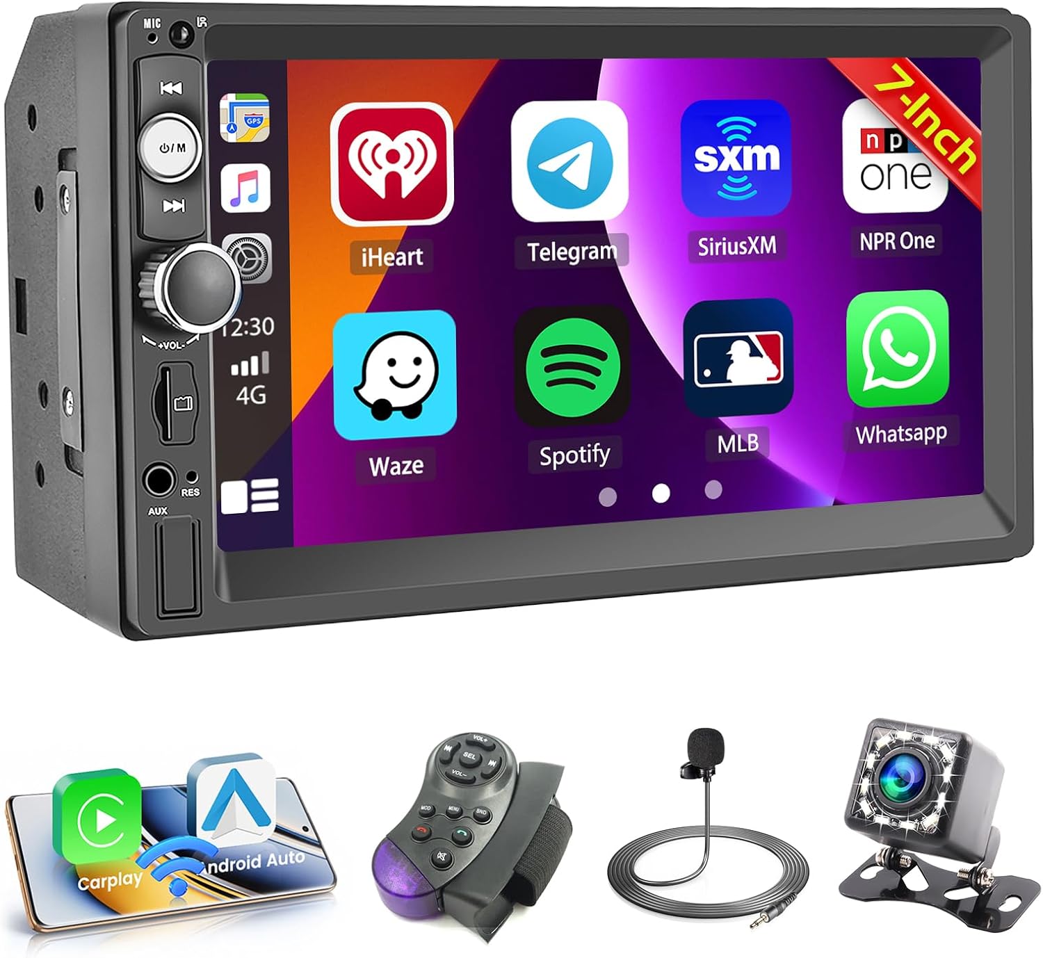 Car Stereo Double Din Wireless Carplay Android Auto, 7 Inch Touchscreen Car Radio Bluetooth 5.1 FM Car Audio Receiver with Backup Camera Mirror Link SWC