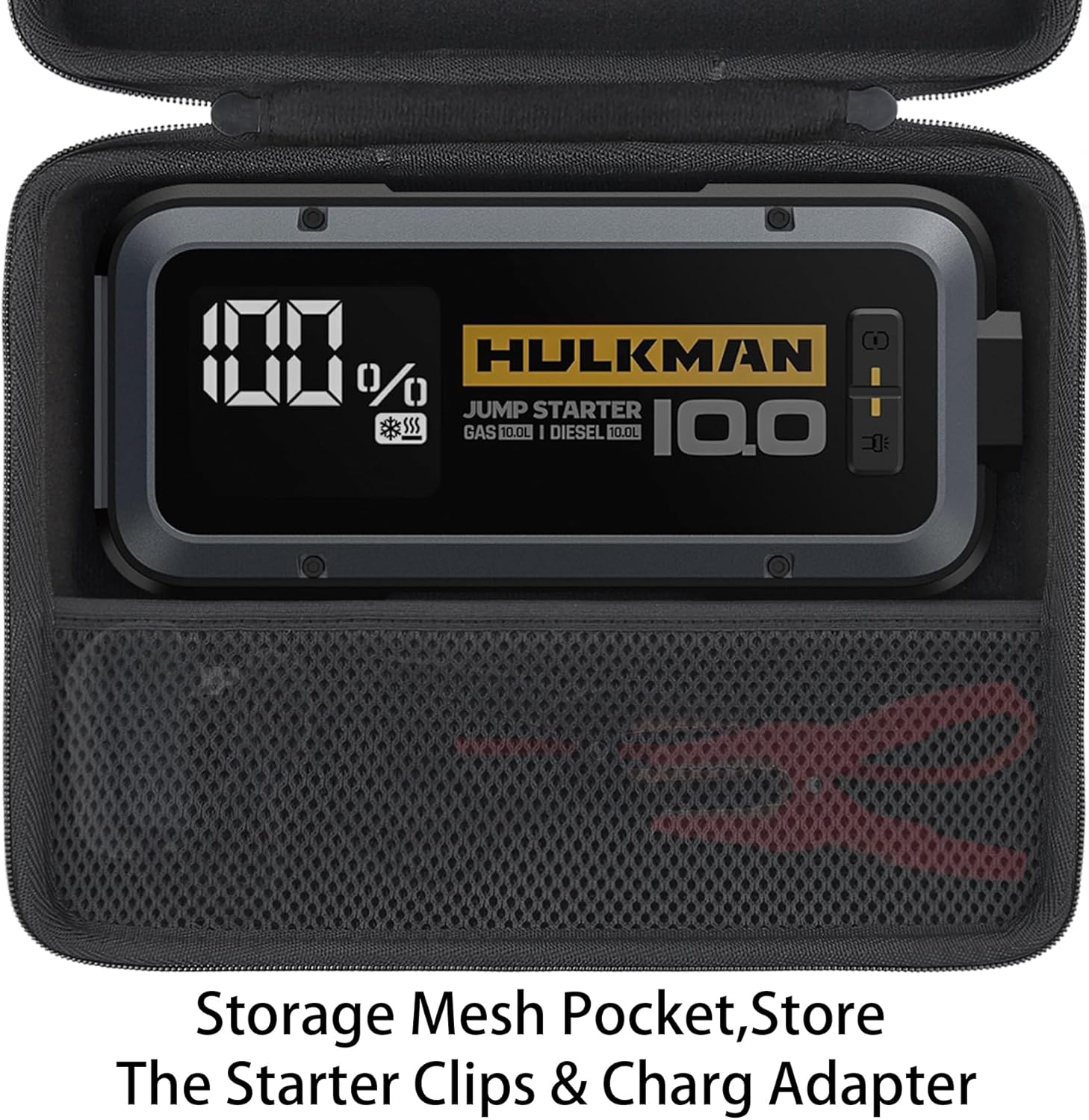 - Reasonable Storage of Jump Starter Accessories:Built-in mesh pocket can store the booster clamps & charge adapter of your hulkman alpha100 jump starter, when your booster clamps and alpha100 battery starter are put together, you can find it quickly when you need to use it.