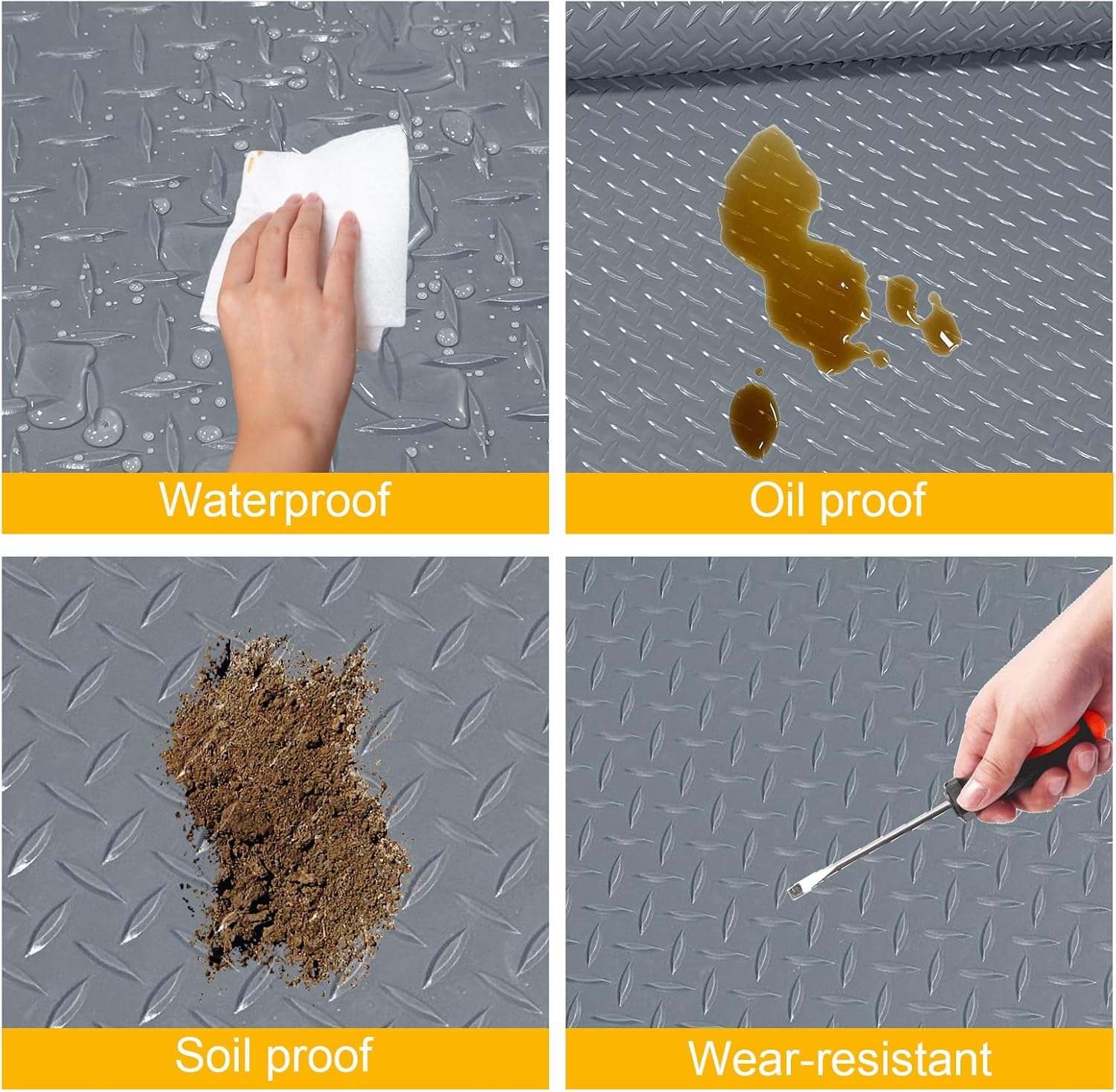 - Anti-Slip Design: The under car mat engineered with a diamond plate texture for superior slip resistance, ensuring safety for both foot traffic and parked vehicles even in damp conditions.In order to make the mat does not slip, you can use double-sided tape on all sides(not included in the package)