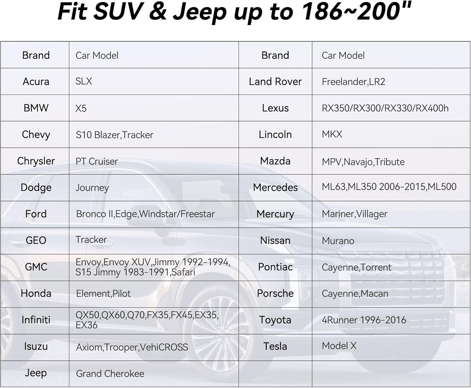 - ăChoose the Right ModelăUniversal fit for SUV which length is up to 200 inch.See the product images for applicable vehicle models.The universal car cover comes with a storage bag,you can store it easily when not used.