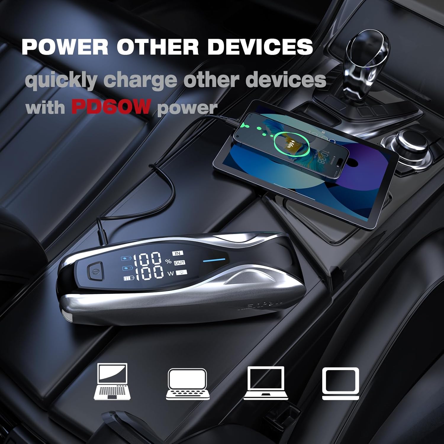 - [PD 60W DUAL - WAY IN/OUTPUT FASTER CHARGI] - NEXPOW X7 battery jump starter supports PD60W charging, charging from 0% to 80% in just 1 hour, shorten the waiting time when you are in a hurry to get out of the house, and also PD60W fast charging for your smart devices, compatible with smartphones, tablets and laptops, etc. (60W adapters are not included)