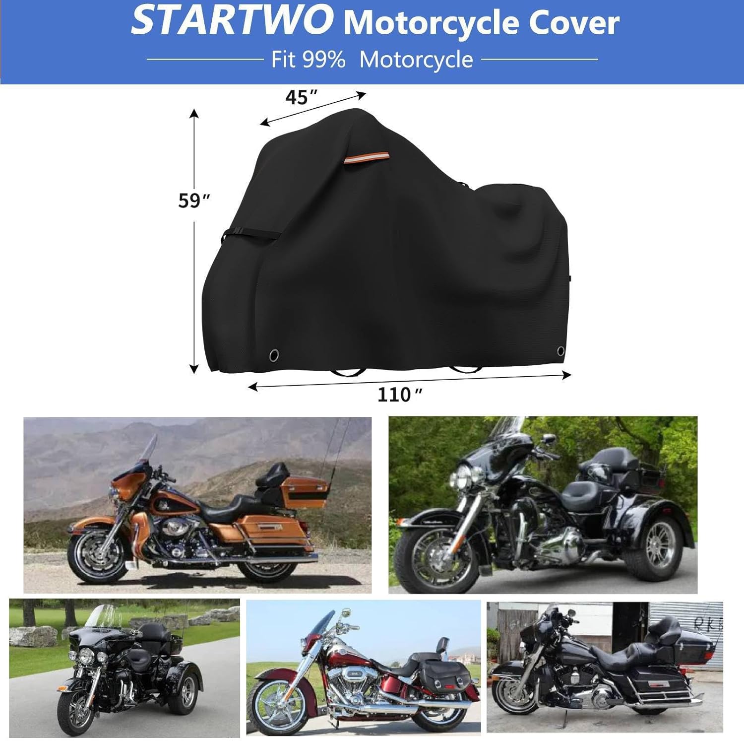 - ăCover SizeăThis motorcycle covers measures 110"L x 45"W x 59"H. Suitable for most motorcycle of conventional models. Our motorcycle storage cover are designed for Harley-Davidson touring models, including Road King, Electra Glide, Street Glide, Road Glide and CVO Version. Please confirm your motorcycle model before purchasing.