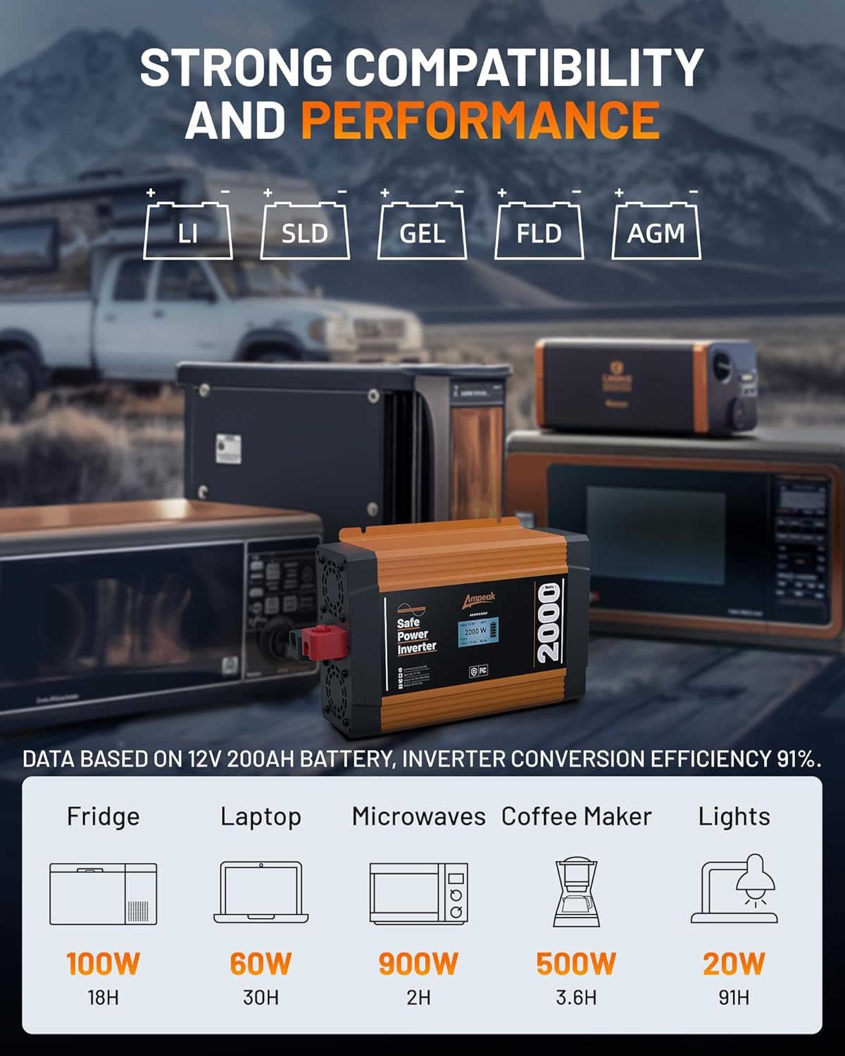 - When Using an Inverter: Please take into consideration the conversion efficiency of the inverter. For example, the Ampeak Sine Wave 2000w has a conversion efficiency of 91%, which means the inverter can support appliances with a power rating of up to 2000w * 91% = 1820W.