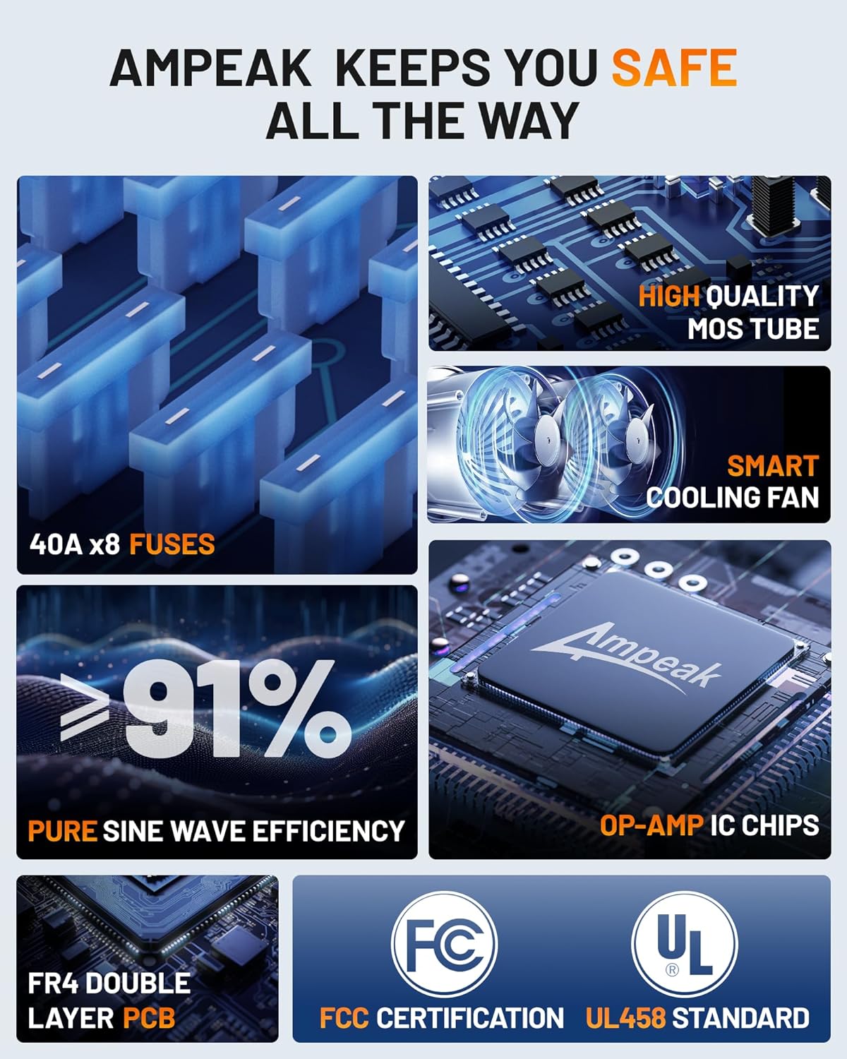 - Soft start and 17 Safety Protections: Ampeak takes safety seriously, designed with an incredible 17 safety protections. With these protections in place, you can be confident that your inverter and devices will operate safely and reliably. This is a significant increase from the 4-5 protections found in most other inverters on the market.