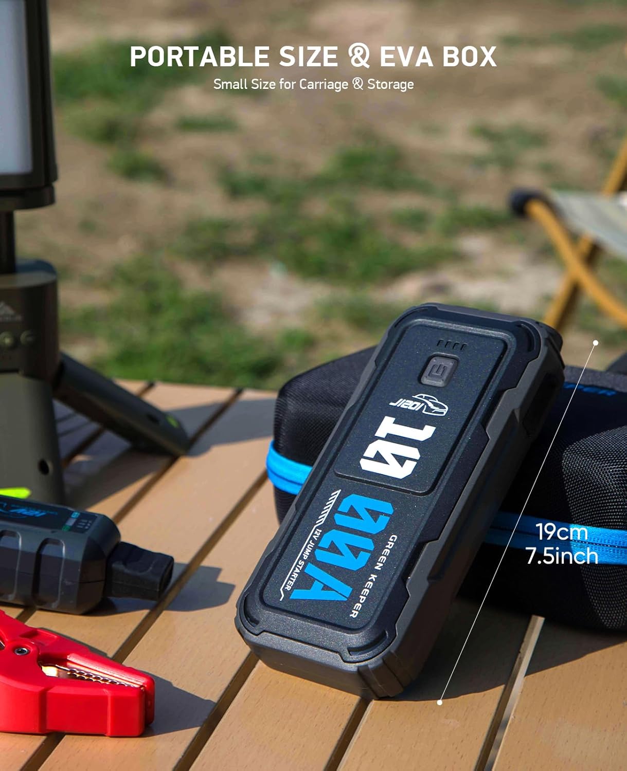 - All-in-One Portable Car Jump Starter: The Green Keeper Jump Starter is a comprehensive car jump starter kit. It comes with a jump start battery pack, heavy-duty jumper cables, a Type-C charging cable, and a durable carrying case. Whether it's for a sedan, SUV, motorcycle, or boat, this portable car jump starter ensures you're never stranded with a dead battery.