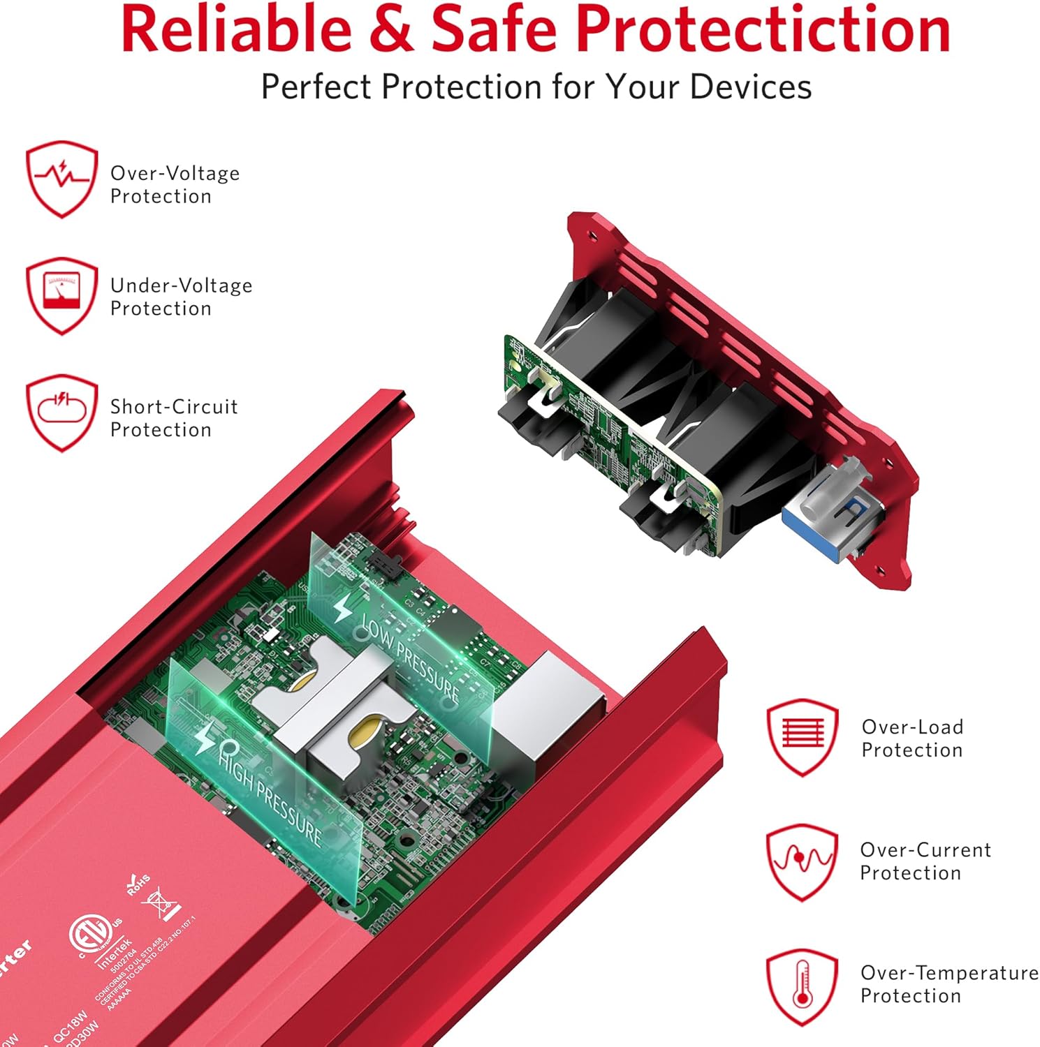 - Isolated Voltage Protects Perfectly for your device from Over-voltage,Under-voltage,Overheat,Overload, Reverse Polarity,Short circuit.it will not drain your battery dry because of an under-voltage protection point.The Inverter does automatically sense overload condition and shuts down AC power when the load exceeds 450W. You will need to power Off/On to reset the overload condition indicated by the Flashing Red.The ON-OFF switch only works for the 3-prong plugs.