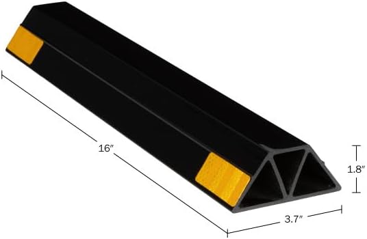 - PRODUCT DETAILS - Materials: Molded Hardened Plastic. Dimensions: (L) 16β x (W) 3.7β x (H) 1.8β; Weight: 3.31lbs. Set of 2 Wheel Stops for Garage. Color: Black with Yellow Visibility Stripes.