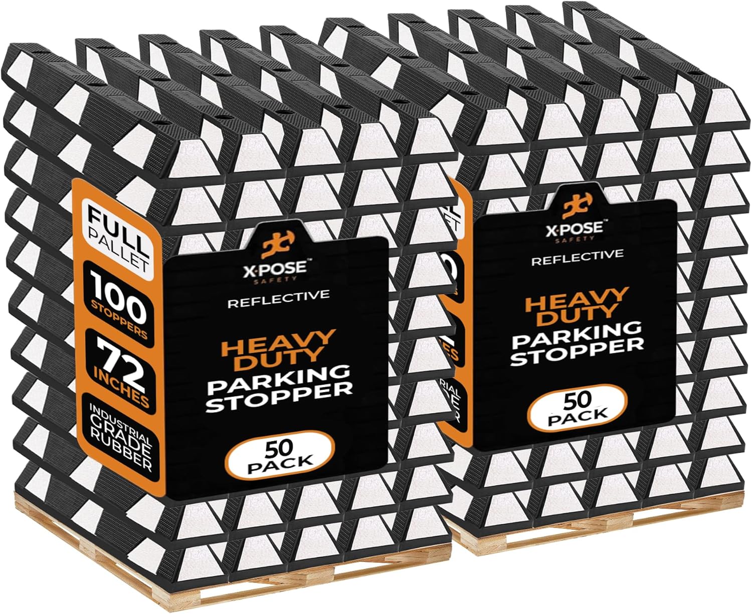 Xpose Safety 72" Heavy Duty Rubber Parking Stopper – Bulk 2 Full Pallets 100 Pack Wheel Blocks for Garage, Driveway, or Ramp – Car Bumper Stop with White Reflective Strips – Removable Floor Mount
