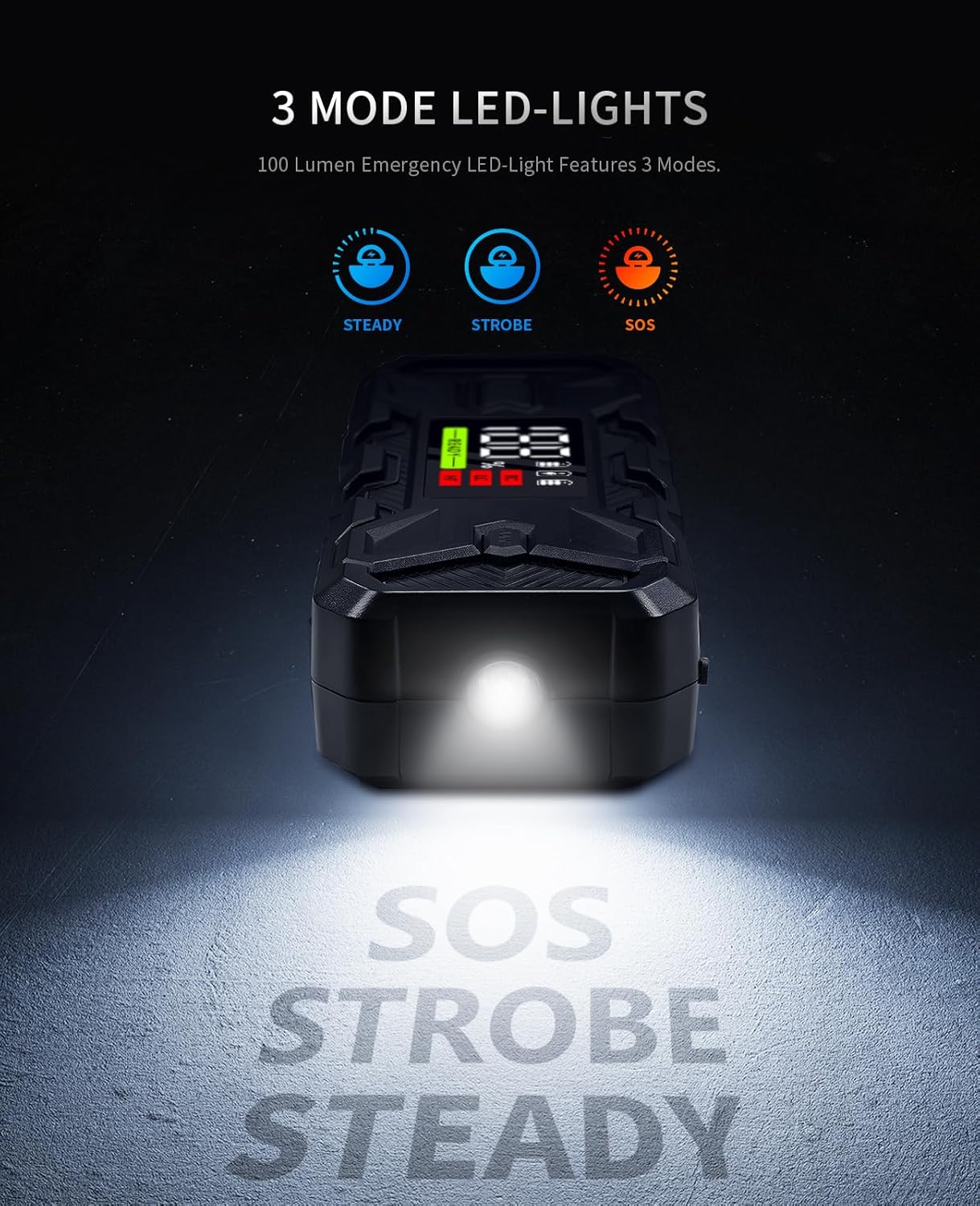 - Ultrasafe Portable Jump Starter: Compact, yet robust, 3000A car jump starter starts dead batteries in minutes reliably in any climate. This car jumper starter kit is suitable for jump starting all 8.0L Gas & Diesel car engines within just a few steps.