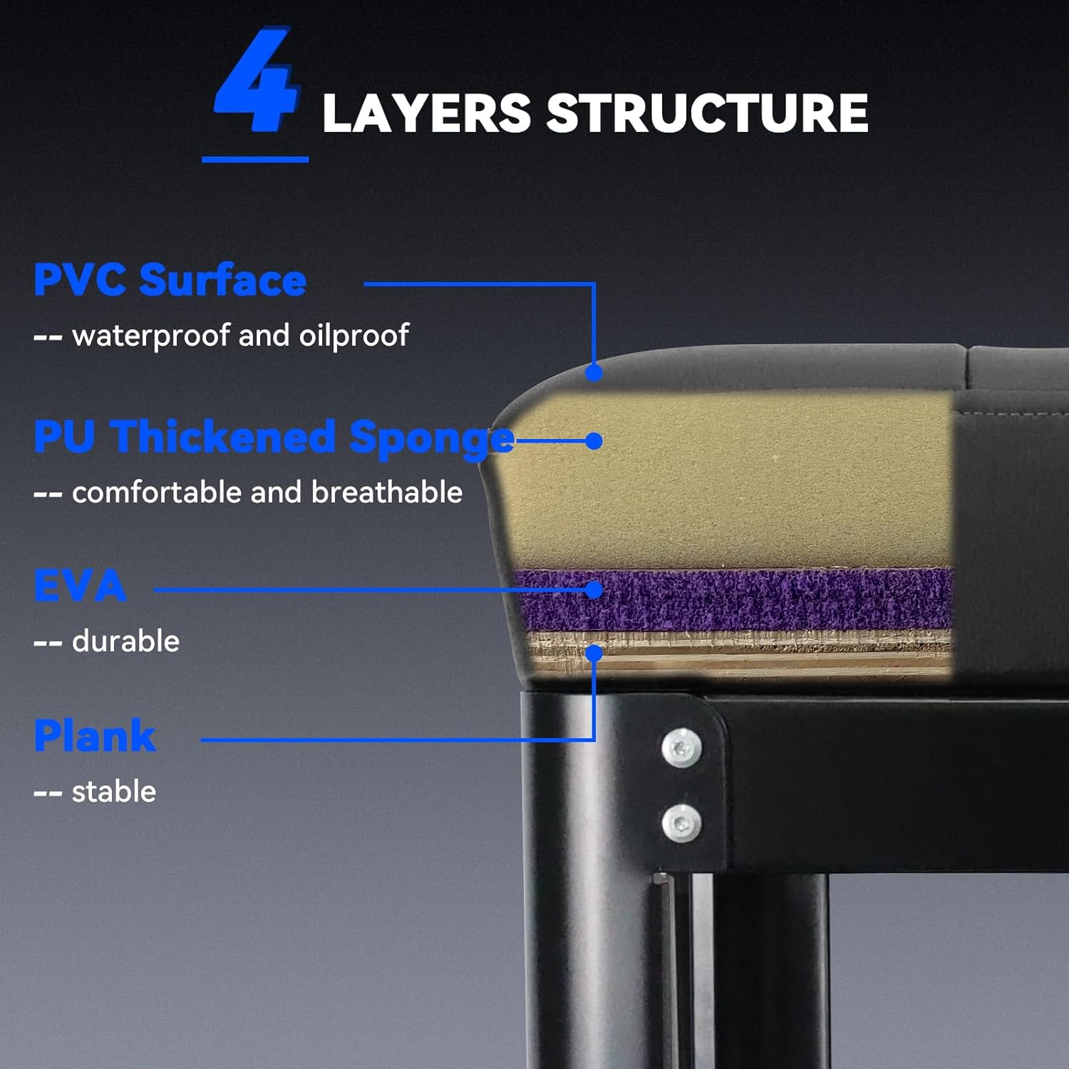 - 【4 layers Structure】The creeper seat cushion is 3.35 inches thick and consists of FOUR layers structure. The first layer is a solid wooden plank, the second layer is a durable EVA, the third layer is a comfortable and breathable PU thickened sponge, and the fourth layer is a waterproof and oilproof PVC surface. Soft, Firm, and Comfortable