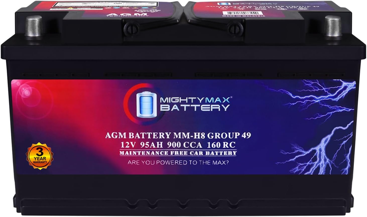 Mighty Max Battery MM-H8 Start and Stop Car BCI Group 49 12V 95Ah, 160RC, 900 CCA Rechargeable AGM Car Battery