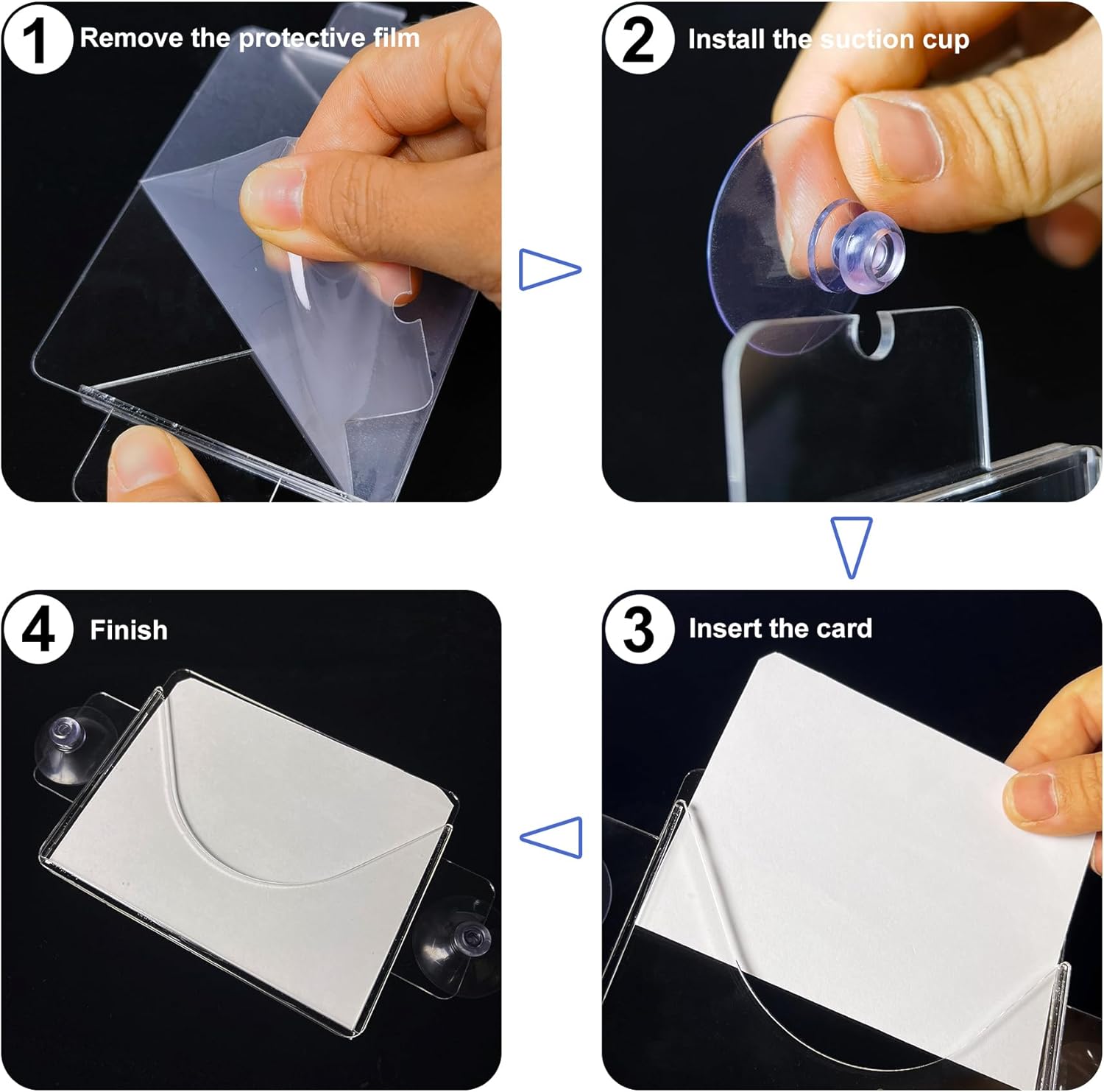 - Distinctive Design:Compared with other self-adhesive holders,this holder is designed with suction cups,easy to pick up, won't leave adhesive marks,has good adsorption,not easy to fall off,lightweight,easy to carry,not easy to wear and tear and break,which can meet the needs of long term use,the half-open design allows you to change your ID card or business card easily.