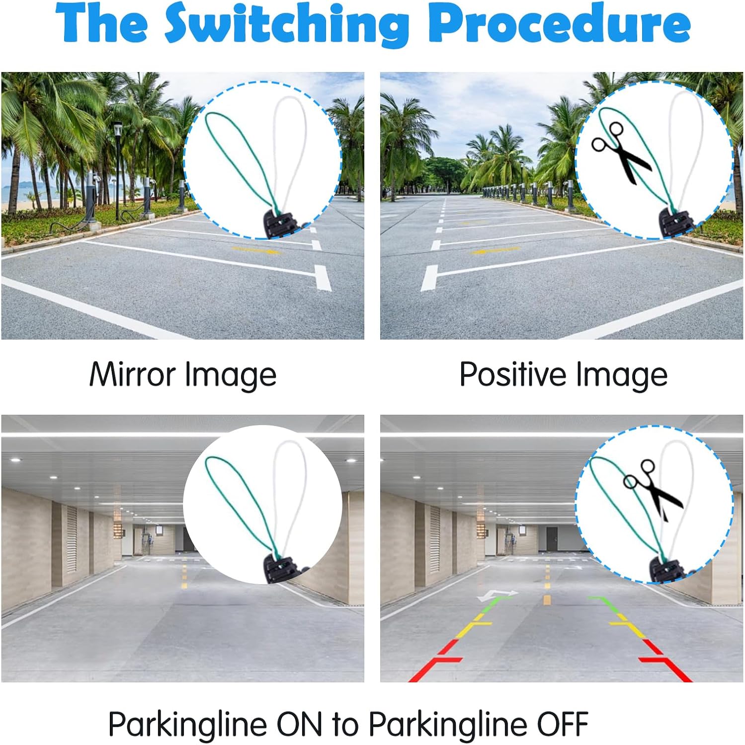 - 【Rear/Front Switchable】Reverse camera for car built in multifunctional switching loops function(white loop and green loop). Mirrored image can be switched on/off, on screen parking guideline can be switched on/off, You Can Use it as Rear View Backup Camera or Front/Side Camera. Note: By default this is a backup camera for cars (mirror image) with no guideline. AND Please Restart your radio again after you cut wire loops.
