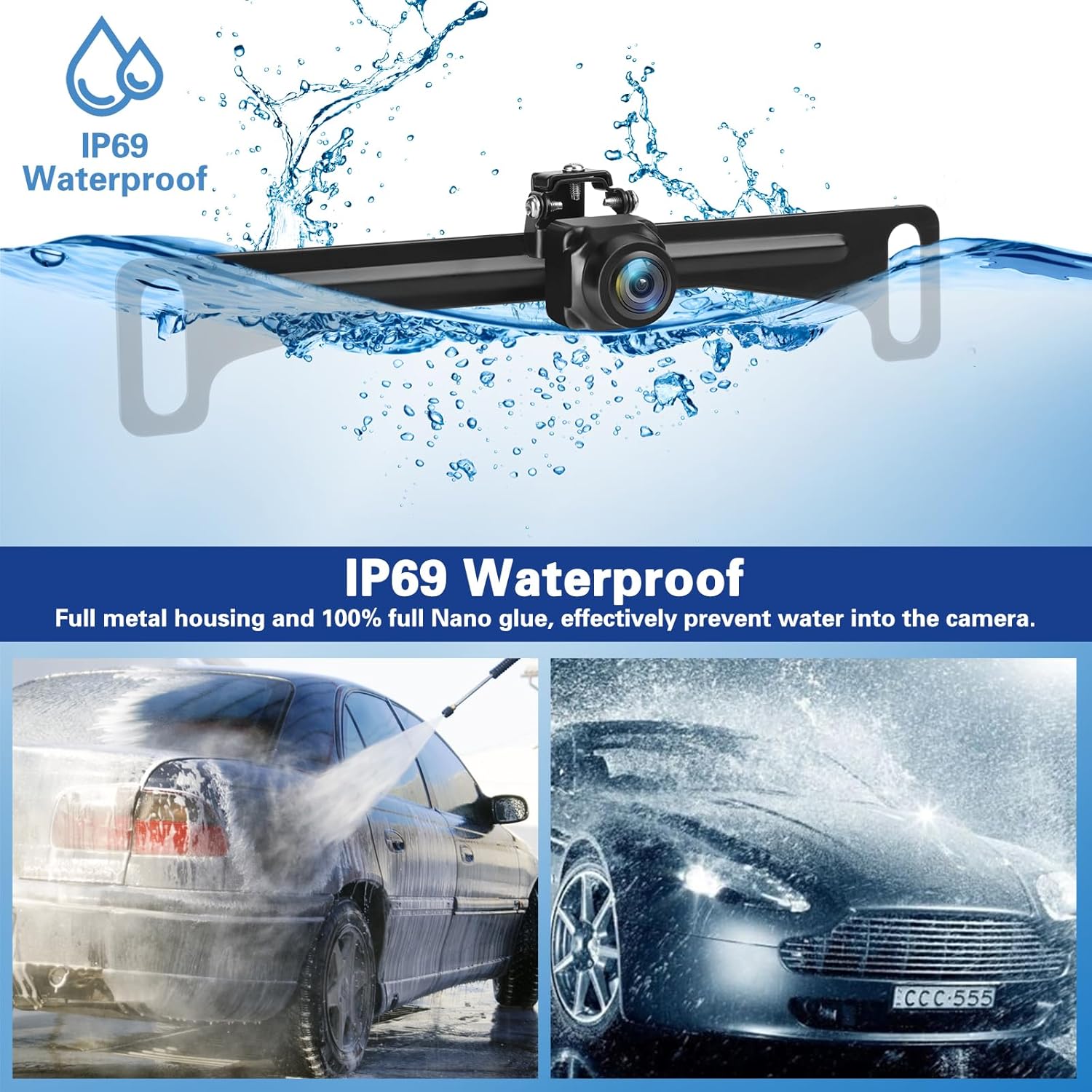 - 【IP69 Waterproof】Sturdy Metal license plate bracket can realize the hidden installation. Rear camera for car is made of high quality material, universal wired backup camera with IP69 waterproof rate, It designed with fully sealed glue filling craft, absolutely no need to worry about water, fog or mist inside, Travel on rainy days and car washing without worry.
