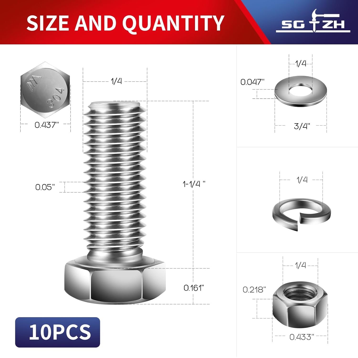 1/4-20 x 1-1/4" Hex Head Screw Bolt, Nuts, Flat & Lock Washers, 10Pcs 18-8 (304) Stainless Steel, Fully Threaded, by SG TZH