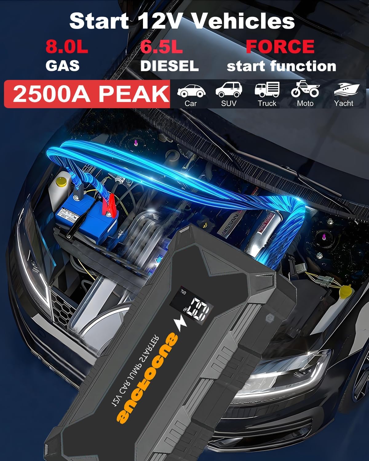 Jump Starter, 2500A Battery Jumper Starter Portable (for 8.0L Gas or 6.5L Diesel Engine), Car Battery Jump Starter, Jump Box, Jump Start Battery Pack with Jumper Cable, LED Light, USB QC3.0 (Black)