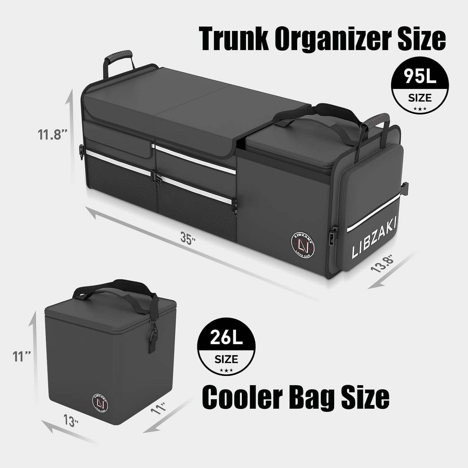 - Ultra-large Capacity: When fully unfolded, the LIBZAKI Trunk Organizer measures 35" x 13.8" x 11.8" (L x W x H) with a capacity of 95L. It fits cars, trucks, jeeps, and minivans, keeping your vehicle clean and organized. Perfect for shopping, camping, or home storage, it meets all your travel and storage needs.