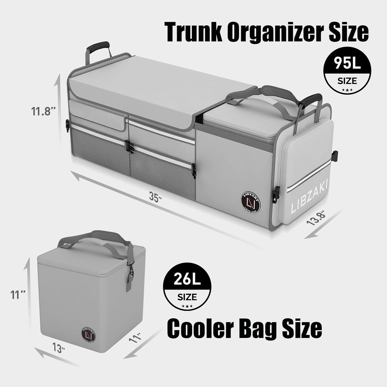 - Ultra-large Capacity: When fully unfolded, the LIBZAKI Trunk Organizer measures 35" x 13.8" x 11.8" (L x W x H) with a capacity of 95L. It fits cars, trucks, jeeps, and minivans, keeping your vehicle clean and organized. Perfect for shopping, camping, or home storage, it meets all your travel and storage needs.