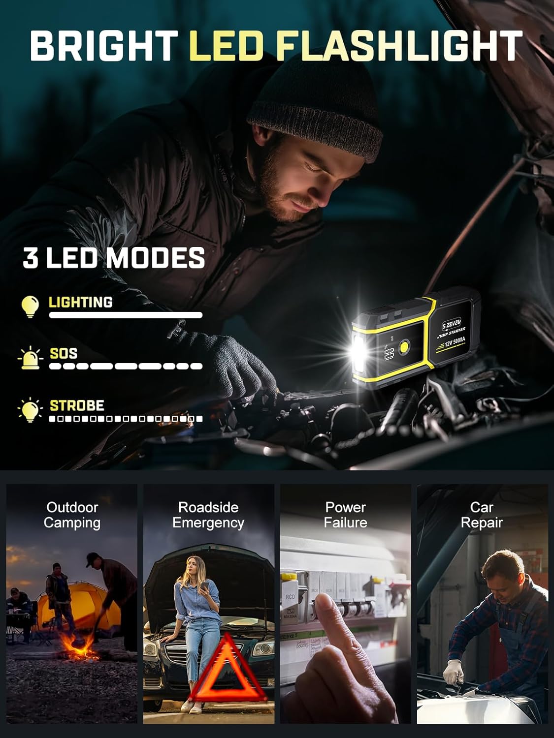 - Versatile Jump Starter WIith Bonus Features: This H021 car jump starter can work as a 500-lume LED flashlight to provide light in darkness or other emergencies with three choosable light modes( stable, strobe, and SOS). More features are accessible on this jump starter such as a Type-C input charging port, 24 months long standby time, dustproof and water-resistant, and a working temperature from -4β to 140β.