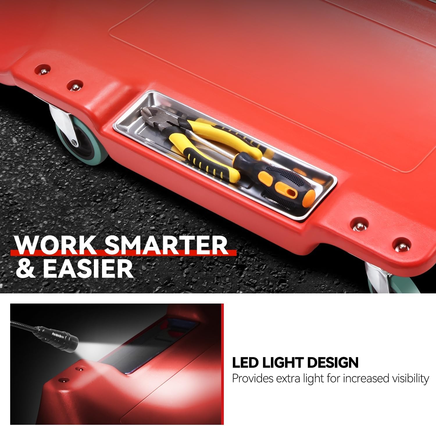 Auto Dynasty 40 Inches Mechanic Creeper, Automotive Garage Repair Low Profile Under Car Rolling Creeper with LED Light and Padded Headrest, Plastic, Red